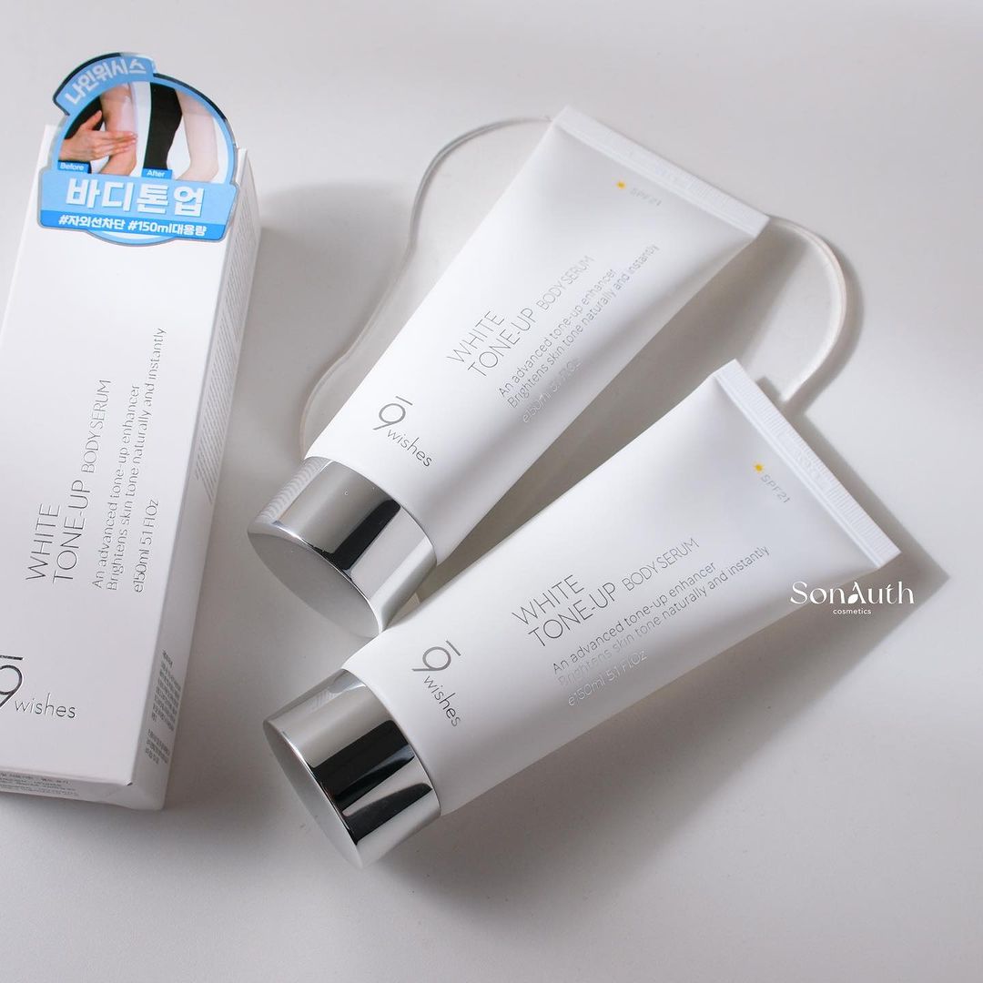 9wishes White Tone Up Body Serum là dạng tinh chất dưỡng sáng nâng tone da giúp da cơ thể sáng mịn, đều màu. Sản phẩm an toàn, có thể sử dụng hằng ngày, đồng thời có SPF21 giúp bảo vệ da chống khỏi tia UV từ nắng. Dưỡng sáng da body khó quá, mãi chẳng thấy hiệu quả đâu thì phải làm sao, đây chính là câu trả lời cho bạn.