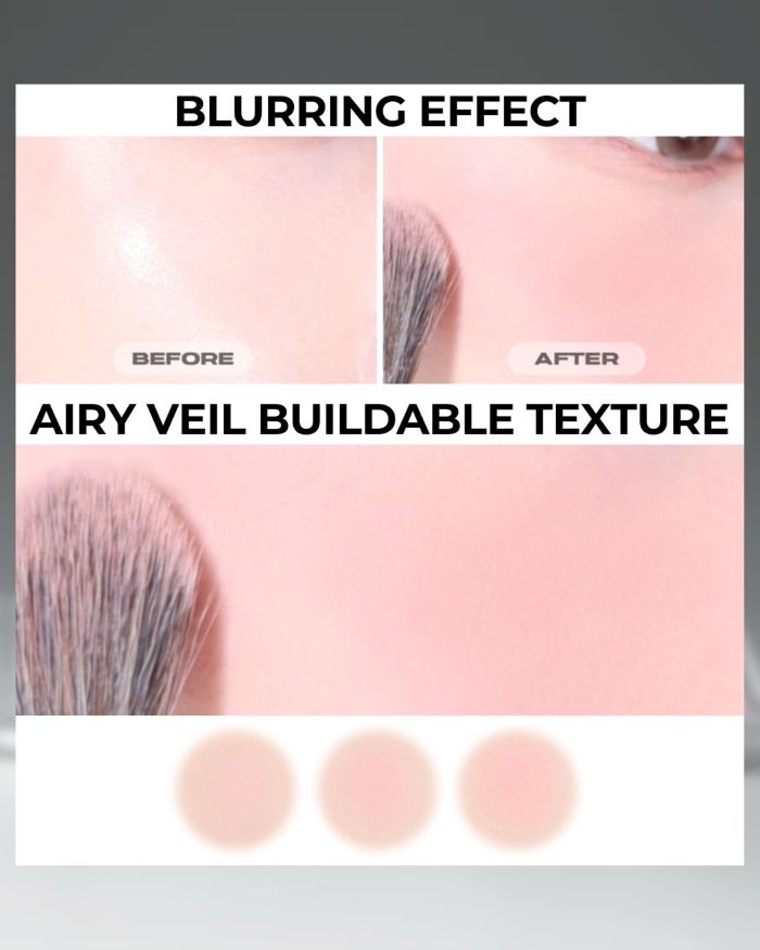 - Hạt phấn nhỏ, vừa giúp màu lên đều và đẹp, vừa có khả năng hút dầu thừa, che phủ lỗ chân lông, mang lại lớp phấn má mịn lì