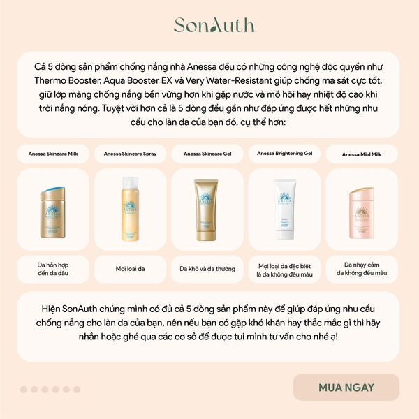 Cả 5 dòng sản phẩm chống nắng nhà Anessa đều có những công nghệ độc quyền như Thermo Booster, Aqua Booster EX và Very Water-Resistant giúp chống ma sát cực tốt, giữ lớp màng chống nắng bền vững hơn khi gặp nước và mồ hôi hay nhiệt độ cao khi trời nắng nóng. Tuyệt vời hơn cả là 5 dòng đều gần như đáp ứng được hết những nhu cầu cho làn da của bạn đó.