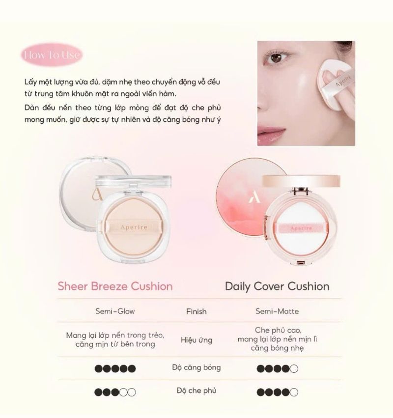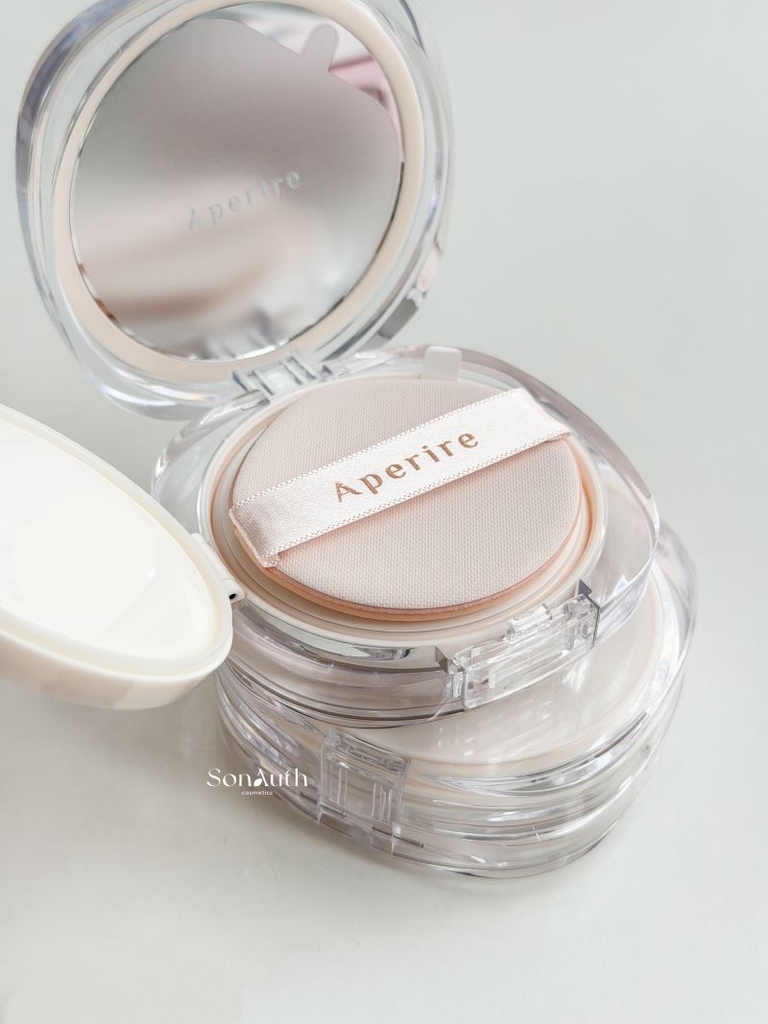 - Aperire Sheer Breeze Cushion là dòng phấn nước thế hệ mới nổi bật với hiệu ứng semi-glow trong trẻo, mang lại lớp nền mỏng nhẹ và căng bóng tự nhiên chuẩn phong cách "glass skin"