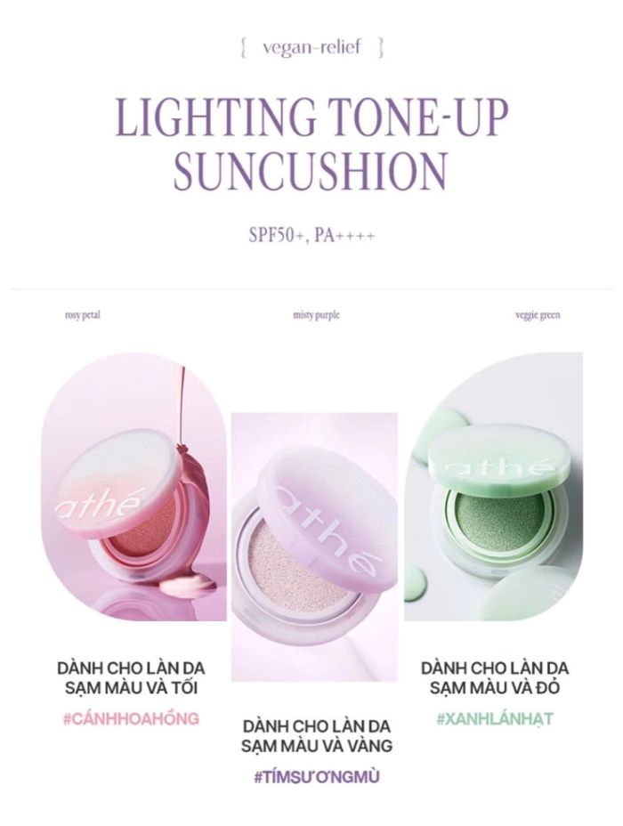 - Athe vegan Relief Lighting Tone Up Sun Cushion là dòng phấn nước độc đáo, được thiết kế đa công dụng: Chống nắng - Hiệu chỉnh tone da - Nâng tone siêu thực