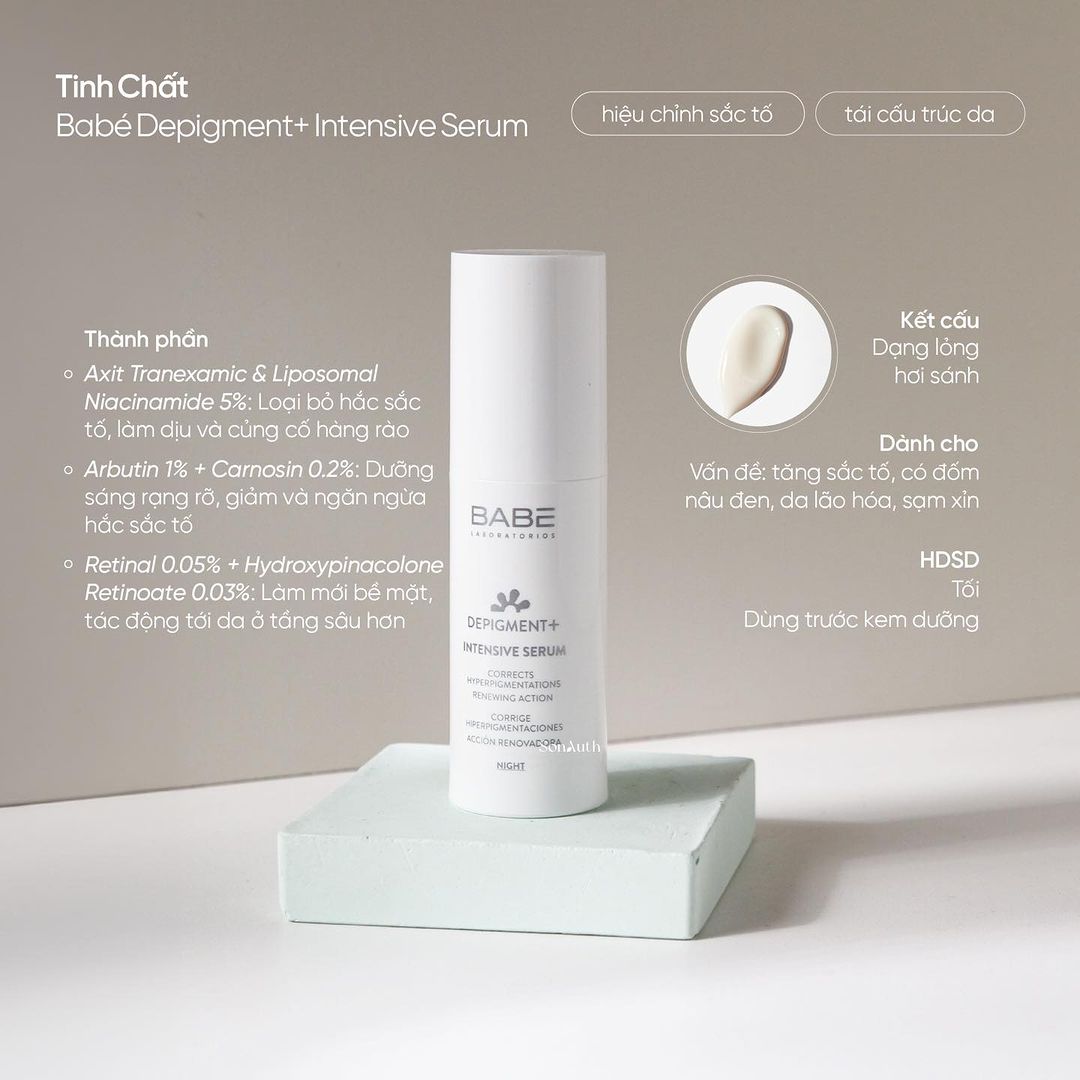 - Babe Depigment+ Intensive Serum là dòng tinh chất dưỡng sáng và mờ thâm hiệu quả cho da có vấn đề về sắc tố