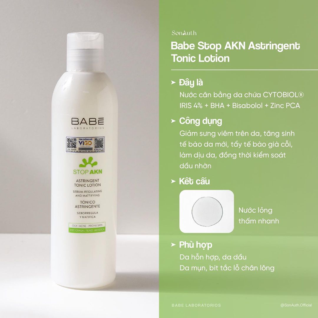 - Babe Stop AKN Astringent Tonic Lotion là nước cân bằng da, được khuyên dùng sau khi làm sạch. Sản phẩm được ví như "thuốc bổ" làm sạch thêm 1 lần sau khi rửa mặt, đồng thời nuôi dưỡng, cân bằng da để tiếp tục các bước dưỡng sau đó hiệu quả hơn