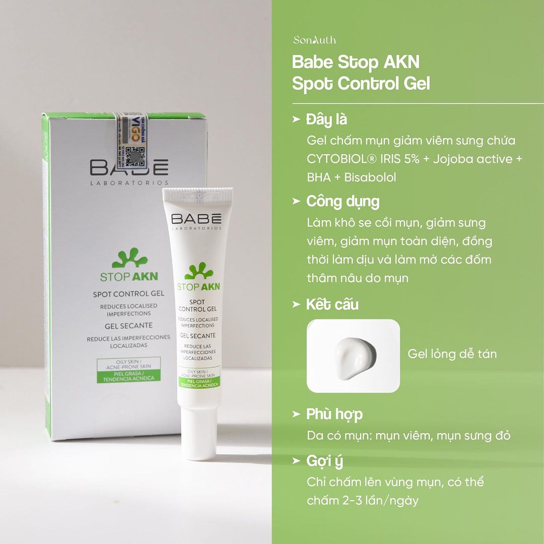 BABÉ Stop AKN Spot Control Gel là sản phẩm chấm điểm mụn dạng gel hiệu quả với những mụn sưng, mụn bọc, viêm đỏ với công thức mang lại tác dụng nhanh chóng