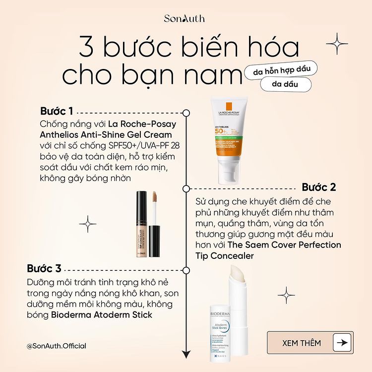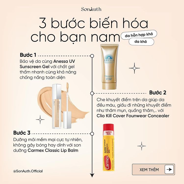 SonAuth đã chuẩn bị vài bước làm đẹp cơ bản dành cho bạn nam, chẳng cần suy nghĩ nhiều mà cứ follow theo thôi 😝 Nếu cậu cần tư vấn thêm thì cứ gửi cho chúng tớ 1 chiếc inbox nha 😘