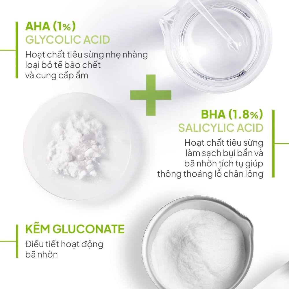 - Công thức chứa 1,8% Salicylic Acid (BHA) , 1% Glycolic Acid (AHA) giúp thông thoáng chân lông