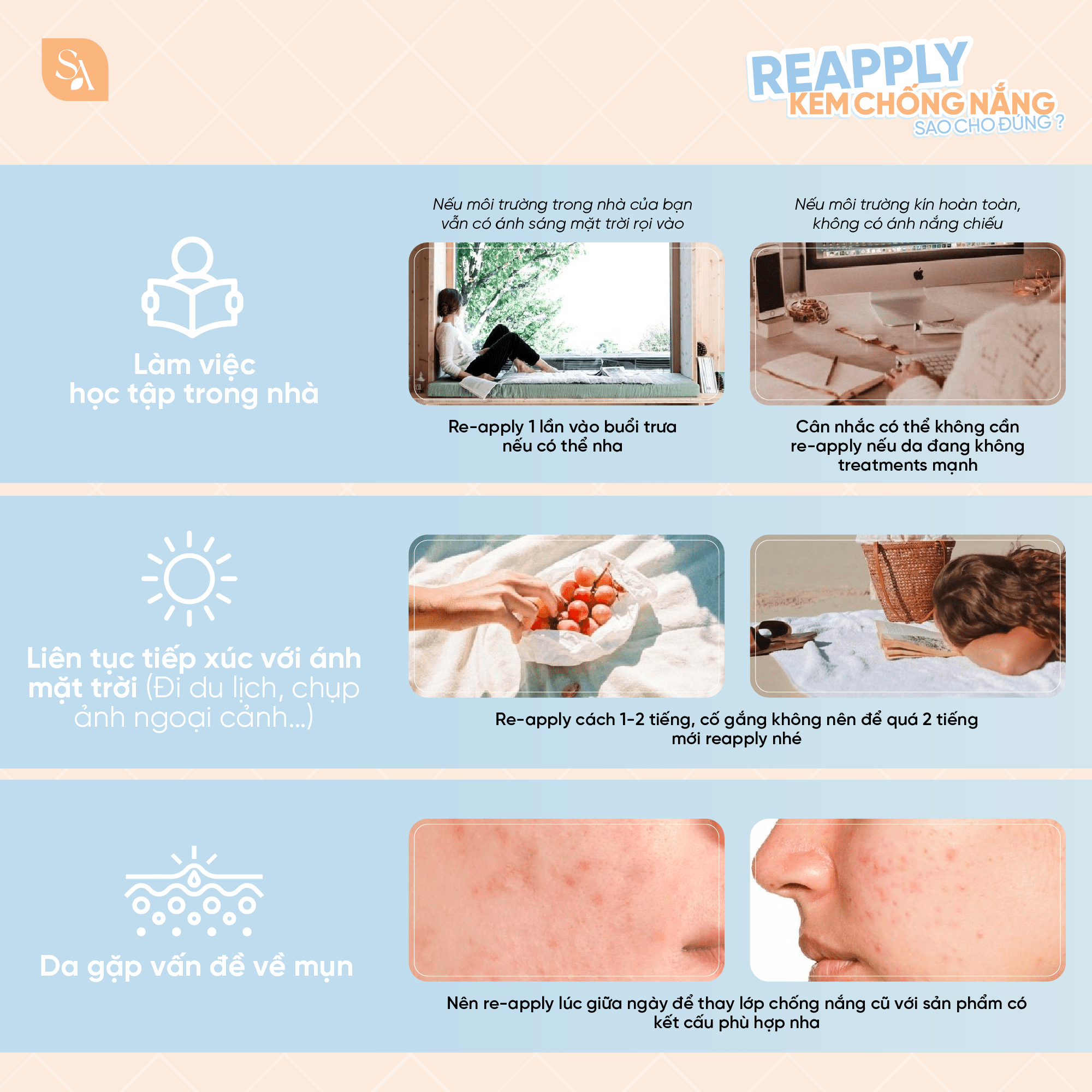 ⛅️ Nhưng mỗi môi trường làm việc, sinh hoạt của chúng ta là khác nhau, nên cũng cần lưu ý về thời điểm và số lần re-apply trong ngày sao cho phù hợp. Vì vậy ở bài viết này hãy để SonAuth “mách” cậu một vài tips re-apply kem chống nắng làm sao để làn da luôn được bảo vệ một cách toàn diện mà không gây cảm giác nặng mặt hay bí da nhé.
