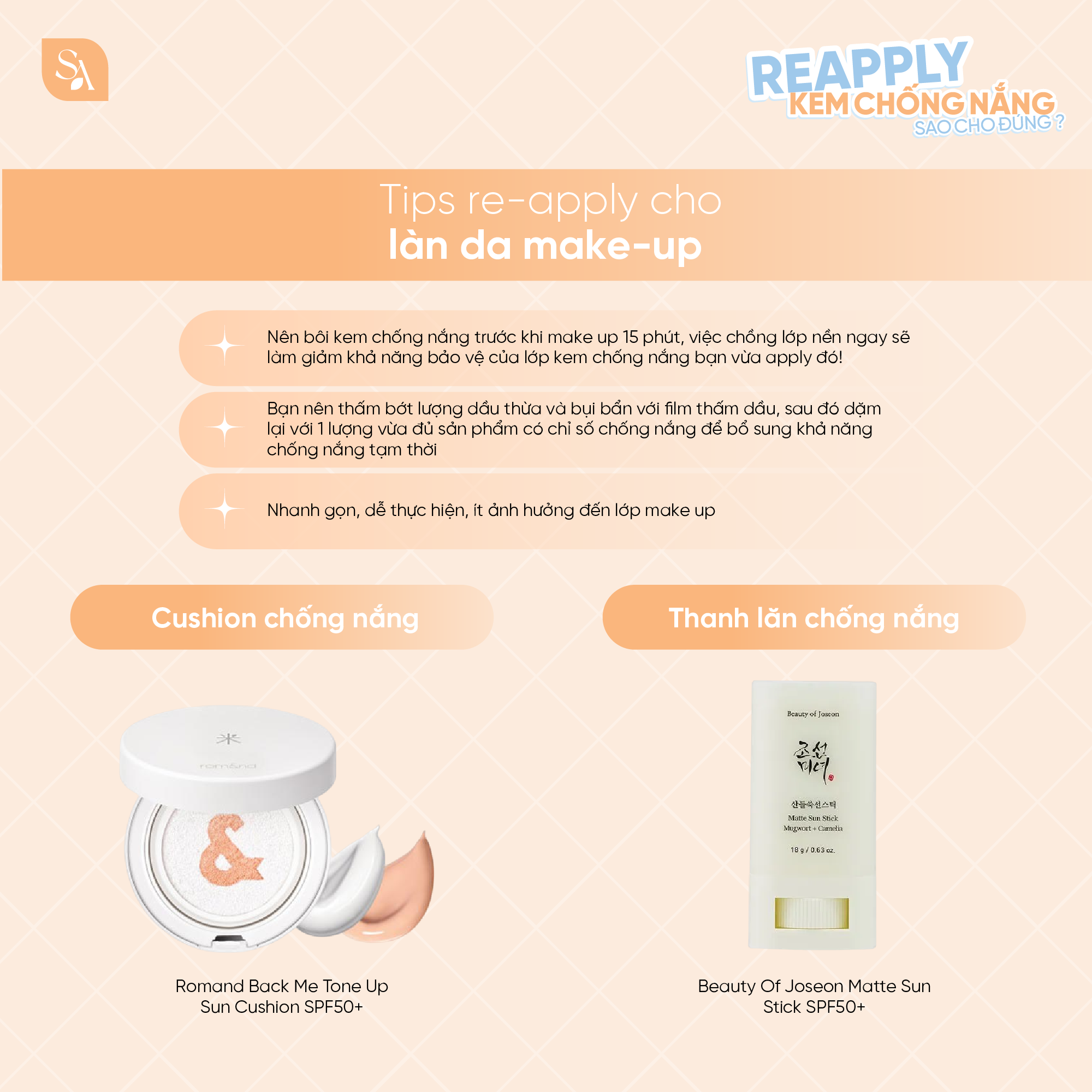 Để kem chống nắng được phát huy trọn vẹn công dụng, để làn da được bảo vệ một cách toàn diện nhất trước những tác hại từ ánh nắng mặt trời, từ môi trường thì việc Re-apply kem chống nắng là việc quan trọng và cần thiết lắm đó cậu nha.