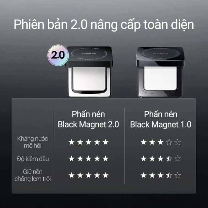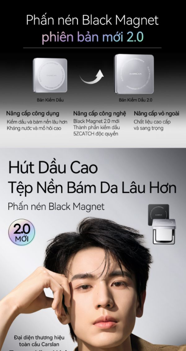 - Với công nghệ độc quyền Black Magnet 2.0: Hút dầu không trôi nền, giúp nền bền lì hơn, dựa trên công nghệ hút dầu từ phiên bản cũ, bản 2.0 được bổ sung thành phần kiềm dầu 5ZCATCH giúp hạn chế tình tiết dầu, không gây bóng nhờn