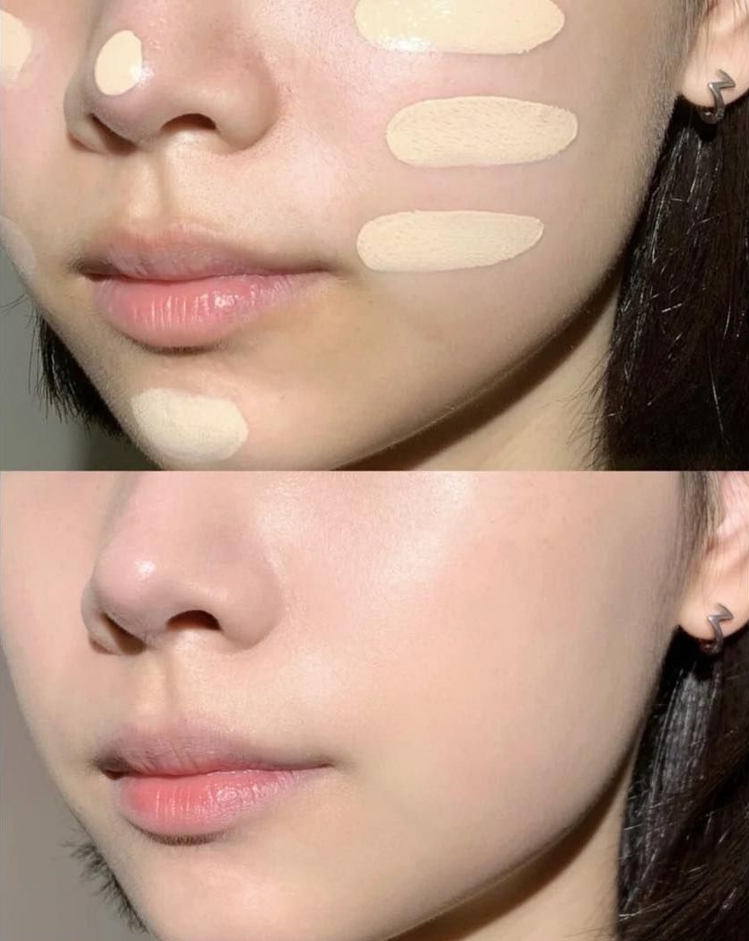 Tán kem nền bằng tay hoặc dụng cụ trang điểm trên toàn bộ gương mặt cho da đều màu, tập trung che phủ những vùng da có khuyết điểm
