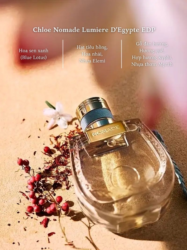Chloe Nomade Lumiere D'Egypte EDP - Sự hoà quyện giữa tự do và ánh sáng đầy quyến rũ. Tựa như ánh mặt trời chạm đến những đụn cát vàng của Ai Cập, Nước Hoa Chloe Nomade Lumiere D'Egypte EDP mang đến làn hương tỏa sáng, gợi cảm và phóng khoáng, dành cho những cô gái yêu tự do, luôn tìm kiếm vẻ đẹp trong từng khoảnh khắc của hành trình.