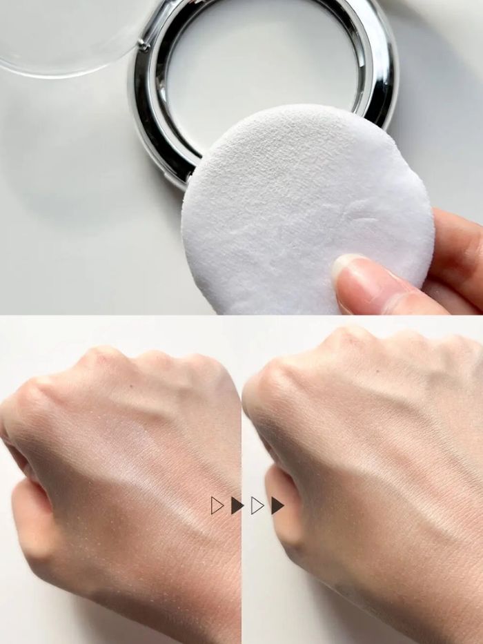 Sử dụng dụng cụ làm đẹp như cọ, bông tán để lấy phấn và thoa đều phấn lên các đường nét trên khuôn mặt để có một lớp nền mịn và đều