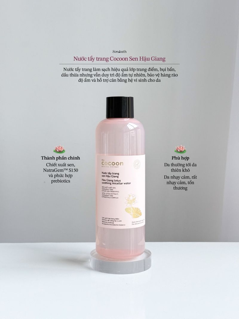 - Cocoon Lotus Soothing Micellar Water là nước tẩy trang dành riêng cho làn da rất nhạy cảm, giúp làm sạch hiệu quả lớp trang điểm, bụi bẩn, dầu thừa nhưng vẫn duy trì độ ẩm tự nhiên, bảo vệ hàng rào độ ẩm và hỗ trợ cân bằng hệ vi sinh cho da.