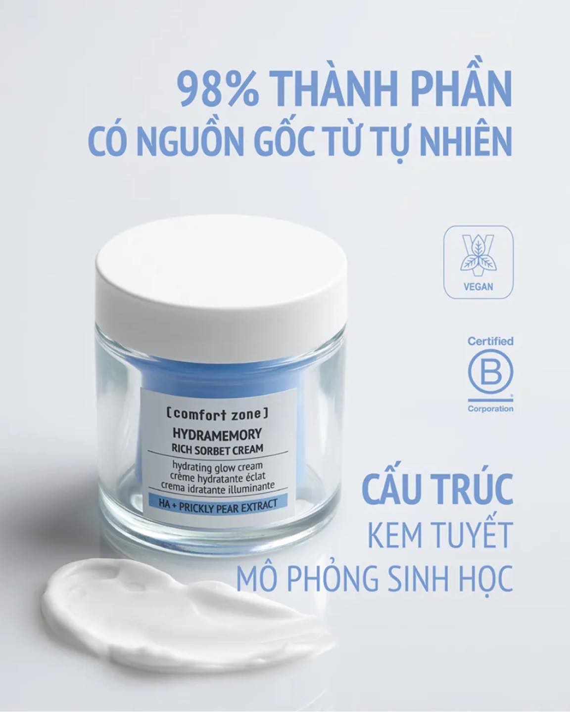 Kem dưỡng ẩm chuyên sâu Comfort Zone Hydramemory Rich Sorbet Cream là lựa chọn hoàn hảo dành cho làn da khô và thiếu nước. Đây là sản phẩm thuần chay với công thức có đến 98% thành phần gốc tự nhiên và được áp dụng công nghệ cấp ẩm tiên tiến giúp nuôi dưỡng da từ sâu bên trong.