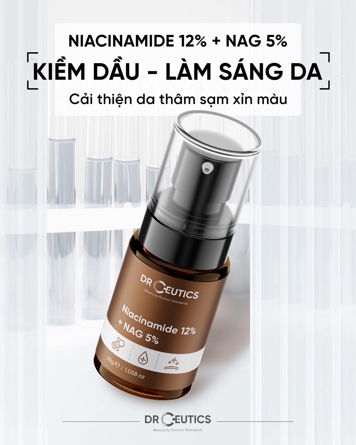 - DrCeutics B3 Niacinamide 12%+ NAG 5% là tinh chất dưỡng da giúp nuôi dưỡng làn da sáng khỏe, đều màu. Với công thức đột phá giúp ức chế hắc sắc tố, đồng thời tiêu sừng, tăng cường khả năng tái tạo mang tới bề mặt da sáng mịn, khỏe khoắn hơn