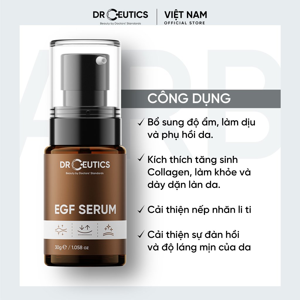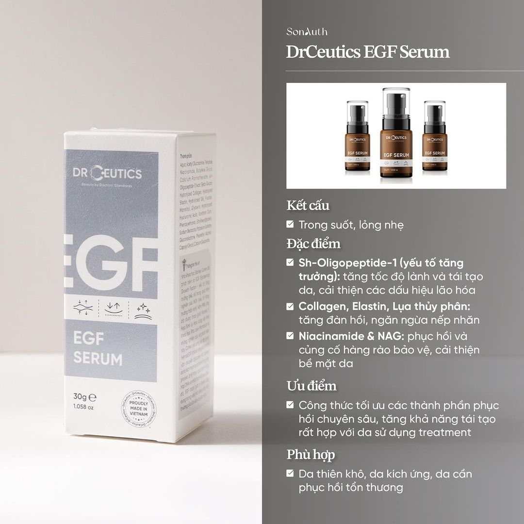 - DrCeutics EGF Serum là tinh chất nuôi dưỡng và cải thiện bề mặt da 1 cách toàn diện. Tinh chất cô đặc có chứa Sh-oligopeptide-1 làm tăng tốc độ chữa lành và tái tạo da, cũng như làm chậm quá trình lão hóa da, do đó giảm thiểu sự xuất hiện của nếp nhăn