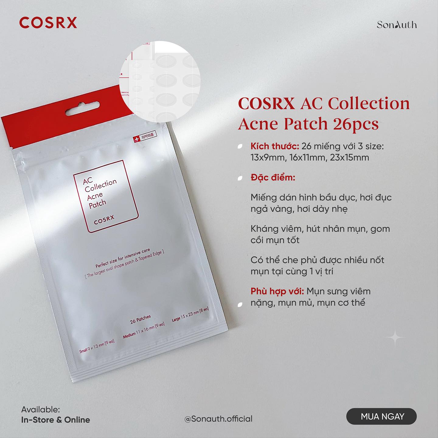 - Cosrx AC Collection Acne Patch là phiên nâng cao và có đủ các ưu điểm từ những phiên bản trước với thiết kế theo hình bầu dục để tiếp cận nhiều diện tích hơn. Các cạnh thon này cho phép miếng dán ẩn mình hoàn toàn với da tự nhiên mà không để lỗ khí tràn vào