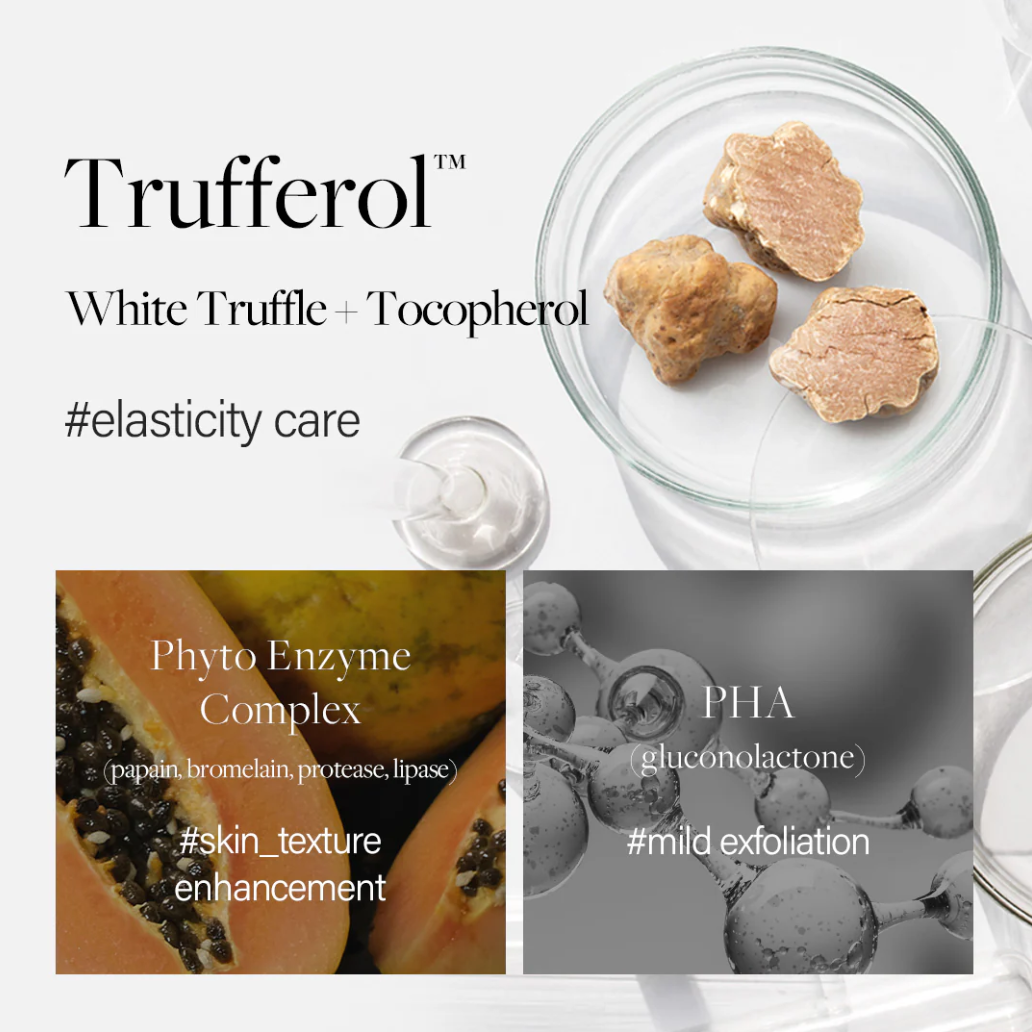 Water, Dipropylene Glycol, Neopentyl Glycol Diheptanoate, Glycereth-26, 1,2-Hexanediol, Tuber Magnatum Extract, Tocopherol, Hydroxyethyl Urea, Sodium Chloride, Betaine, Persea Gratissima (Avocado) Oil, Rosa Damascena Flower Water, Butylene Glycol, Sorbitol, Helianthus Annuus (Sunflower) Seed Oil, Disodium EDTA, Centella Asiatica Extract, Camellia Sinensis Leaf Extract, Houttuynia Cordata Extract, Portulaca Oleracea Extract, Adenosine, Olea Europaea (Olive) Fruit Oil, Macadamia Ternifolia Seed Oil, Camellia Japonica Seed Oil, Oenothera Biennis (Evening Primrose) Oil, Gluconolactone, Glycerin, Glycine Soja (Soybean) Oil, Hippophae Rhamnoides Fruit Oil, Opuntia Ficus-Indica Stem Extract, Castanea Crenata (Chestnut) Shell Extract, Diospyros Kaki Leaf Extract, Bixa Orellana Seed Oil, Protease, Papain, Bromelain, Lipase, Fragrance, Linalool, Hexyl Cinnamal, Limonene