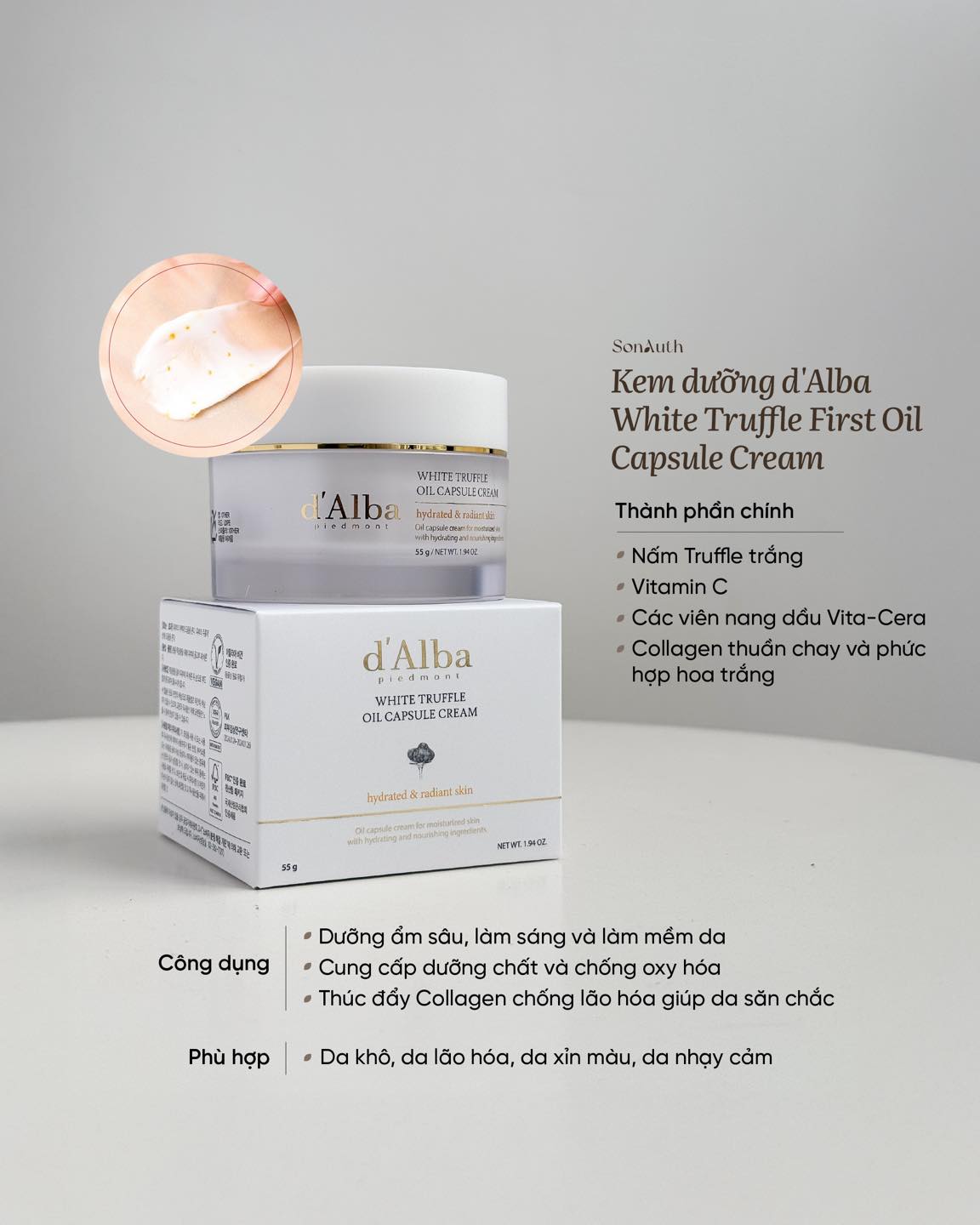 d'Alba Vita Toning Capsule Cream thuộc bộ d'Alba White Truffle giúp cung cấp dưỡng chất làm sáng da, chống lão hóa và giữ ẩm, giúp làn da mịn màng, săn chắc. "Top 1 Oliveyoung”, “luôn cháy hàng”, “100% thuần chay”, “trẻ hóa”, “căng bóng”... là những từ khóa chính mọi người thường nói về dòng sản phẩm nổi bật này của d’Alba.