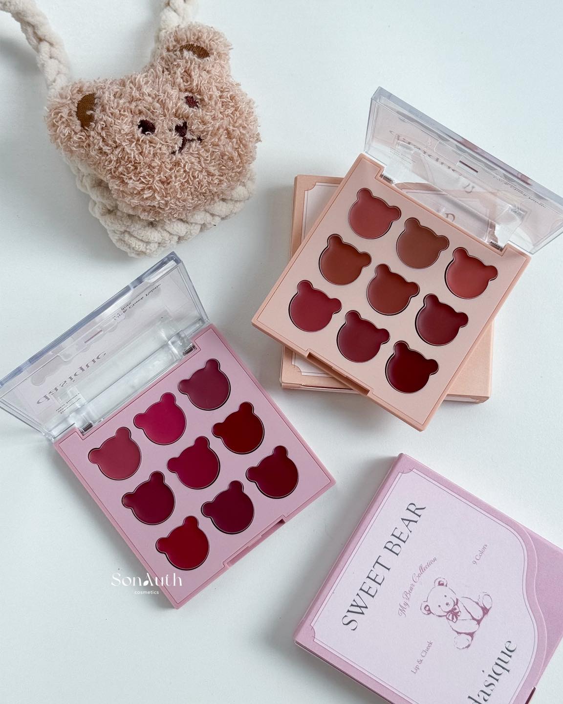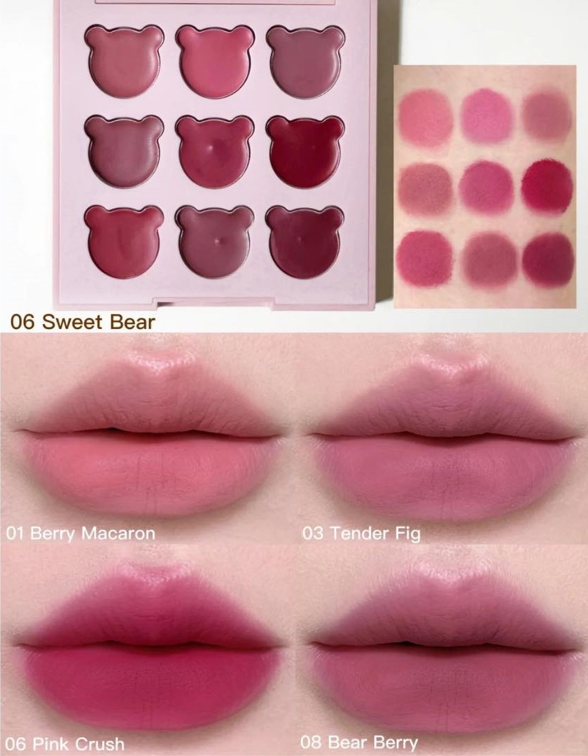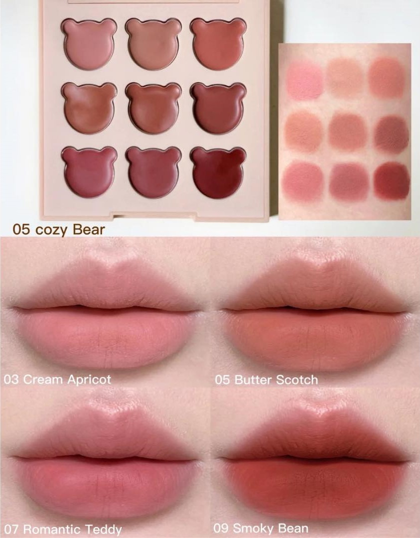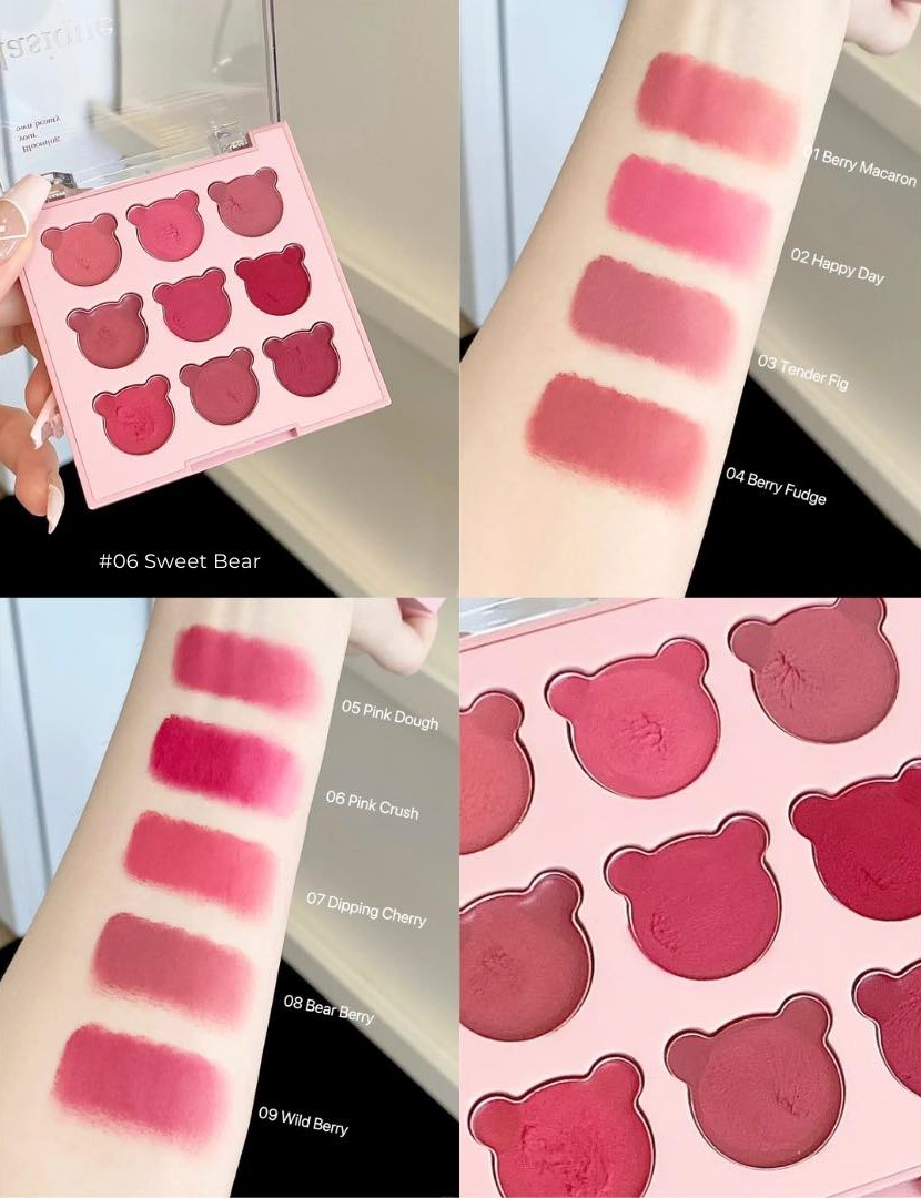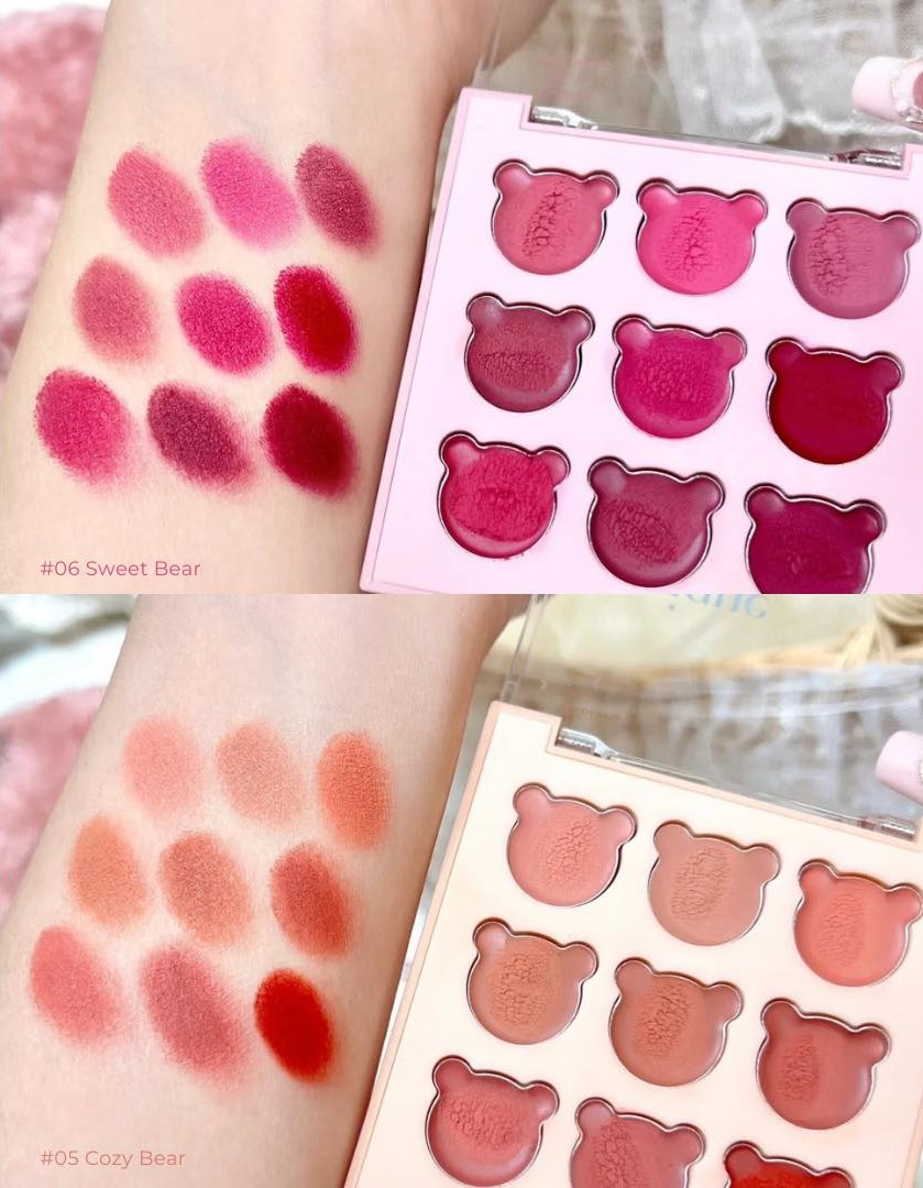- Bảng màu tạo ra lớp trang điểm môi và má tùy chỉnh với các tone màu lấy cảm hứng từ cảm giác ấm mềm và màu sắc nhẹ nhàng của chú gấu bông thời thơ ấu