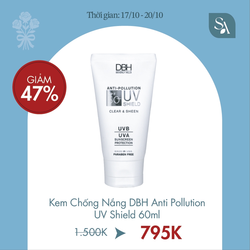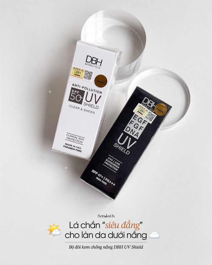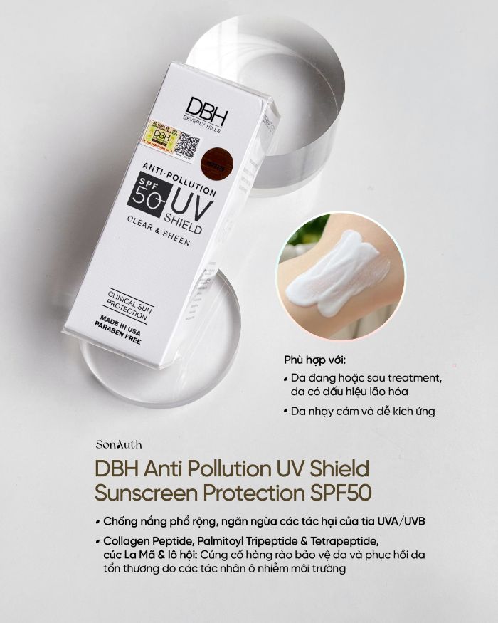 - DBH Anti Pollution UV Shield là kem chống nắng không màu đạt chuẩn lâm sàng với công thức tiên tiến vượt trội chứa các chất chống oxy hóa và các thành phần đạt tiêu chuẩn USP, chuẩn lâm sàng được FDA công nhận