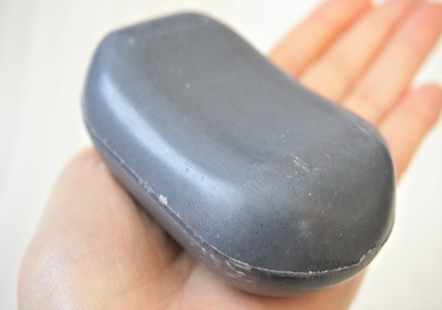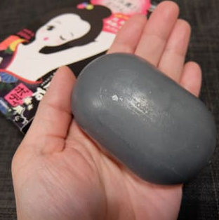 Bánh xà phòng màu xám đen có hạt li ti, tạo bọt vừa phải, giúp giữ được độ ẩm trên da chứ không gây căng kít