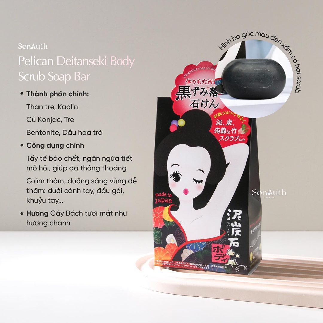 Nhật Bản luôn là phần còn lại của thế giới trầm trồ bởi những sản phẩm ít người nghĩ tới, ấy vậy mà đất nước này vẫn đang hàng ngày sử dụng và hiệu quả thì bất ngờ. Bạn gặp nhiều vấn đề với vùng da dưới cánh tay, vốn khá nhạy cảm, và rất cần được chăm sóc kĩ càng? Các loại lăn khử mùi thì chỉ giảm được phần nào mùi cơ thể, còn về phần trị thâm thì hầu như khó để xử lý. Xà Phòng Pelican Deitanseki Body Scrub Soap Bar  thuộc dòng sản phẩm "Peatstone" bán chạy từ lâu của Pelican Soap, tập trung vào việc làm sạch lỗ chân lông cùng những thành phần thiên nhiên sẽ giải quyết giúp bạn.