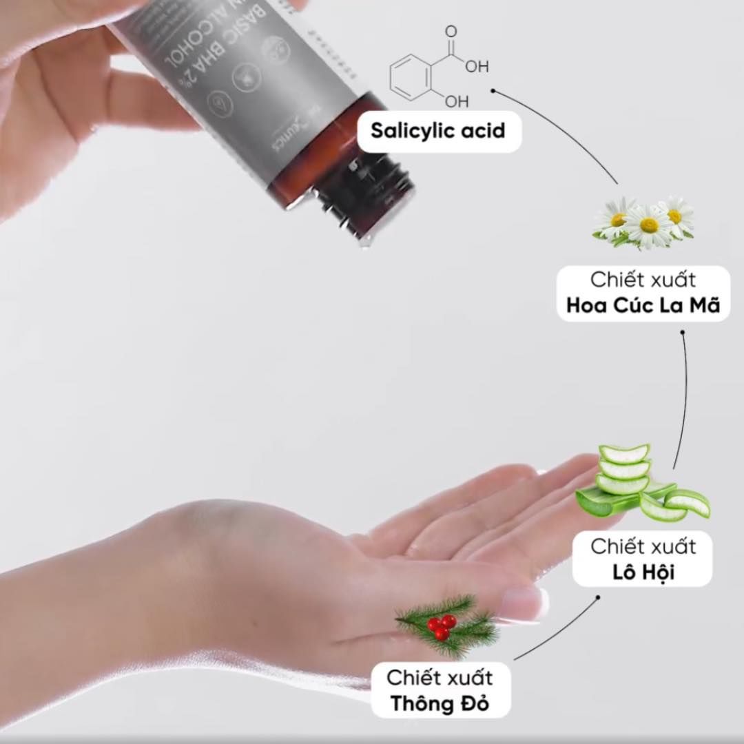 - Sản phẩm nền cồn chứa 2% Salicylic Acid giúp làm bong tế bào da, tiêu sừng, thông thoáng và giảm kích thước lỗ chân lông, chống viêm, kháng khuẩn, kháng nấm, ngăn ngừa và điều trị mụn trứng cá, đồng thời còn giúp các tác nhân bôi ngoài da khác thấm vào da và phát huy tác dụng tốt hơn, giảm sự xuất hiện của các nếp nhăn và cải thiện kết cấu da. Acid salicylic cũng là thành phần được FDA công nhận có khả năng điều trị mụn hiệu quả