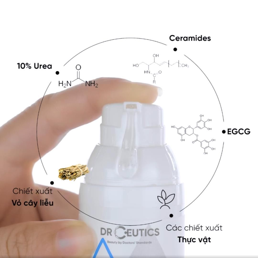 - Thành phần chứa 10% Hydroxyethyl Urea, Urea là thành phần có độ an toàn cho da, có tác động chính là giúp giữ ẩm cho làn da, giúp cho da ngậm nước và đàn hồi hơn. Cơ chế là phá liên kết sừng già, làm tăng độ ẩm của da bằng cách làm mềm/hòa tan các chất sừng (keratin) giữ các lớp tế bào da với nhau