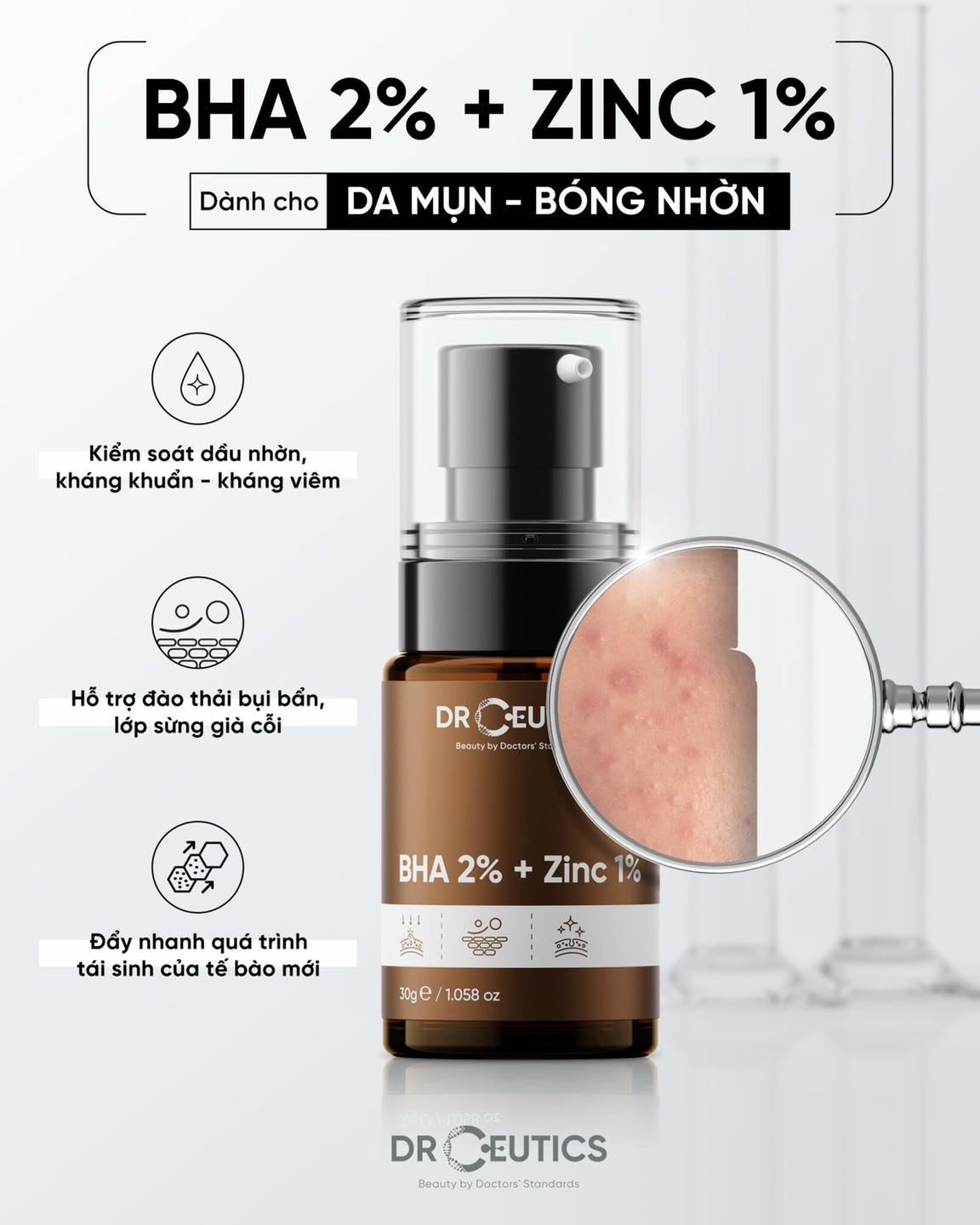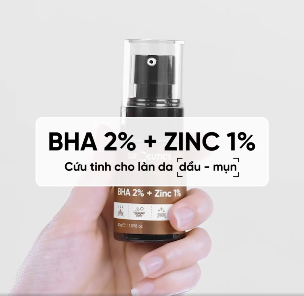 - DrCeutics BHA 2% + Zinc 1% là tinh chất cô đặc giúp ngăn ngừa mụn và cải thiện tình trạng mụn với công thức độc đáo, hiệu quả mà vẫn dịu da trong công thức thân nước không chứa cồn