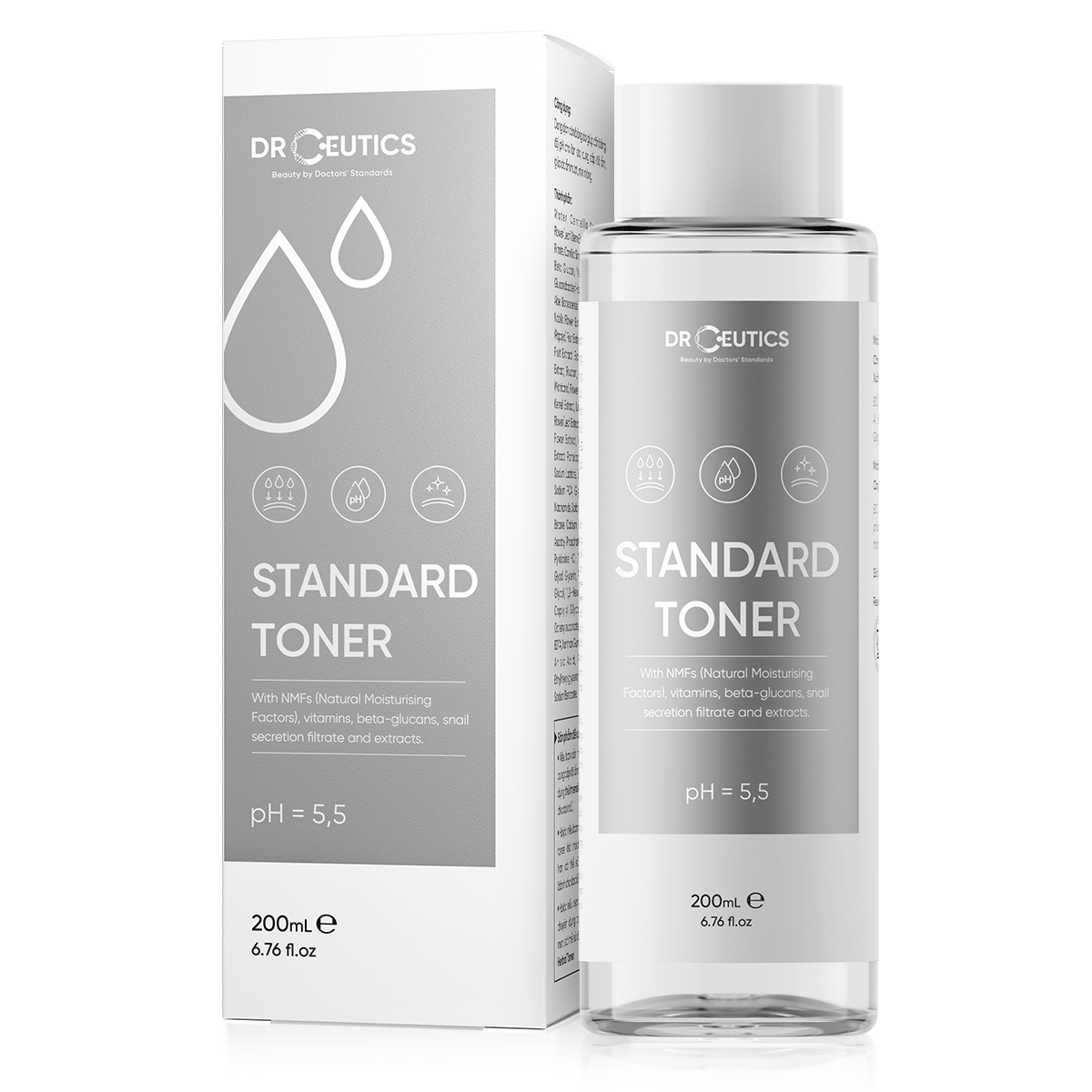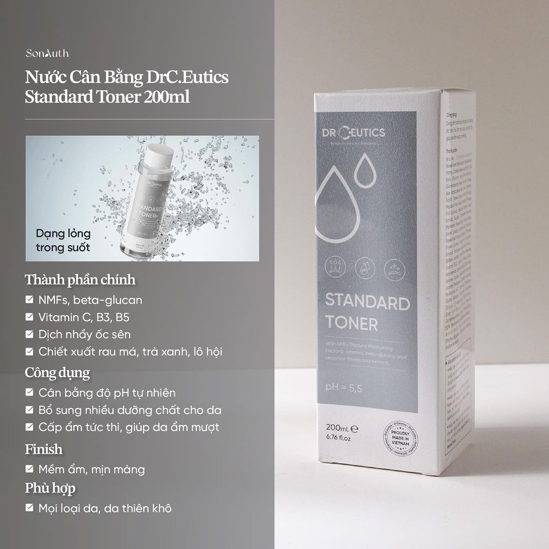 DrCeutics Standard Toner là nước cân bằng da có công thức dồi dào các thành phần như NMFs (Natural Moisturising Factors), vitamins (vitamin C, B3, B5), beta-glucans, dịch nhầy ốc sên và nhiều dịch chiết thiên nhiên.