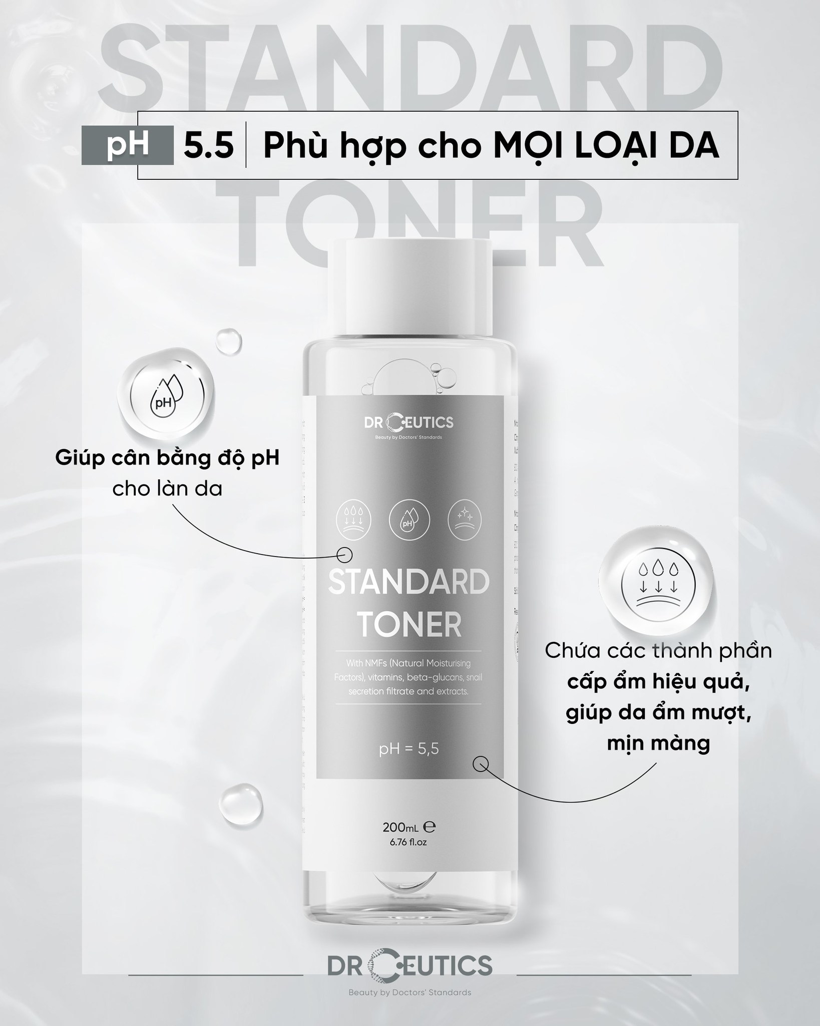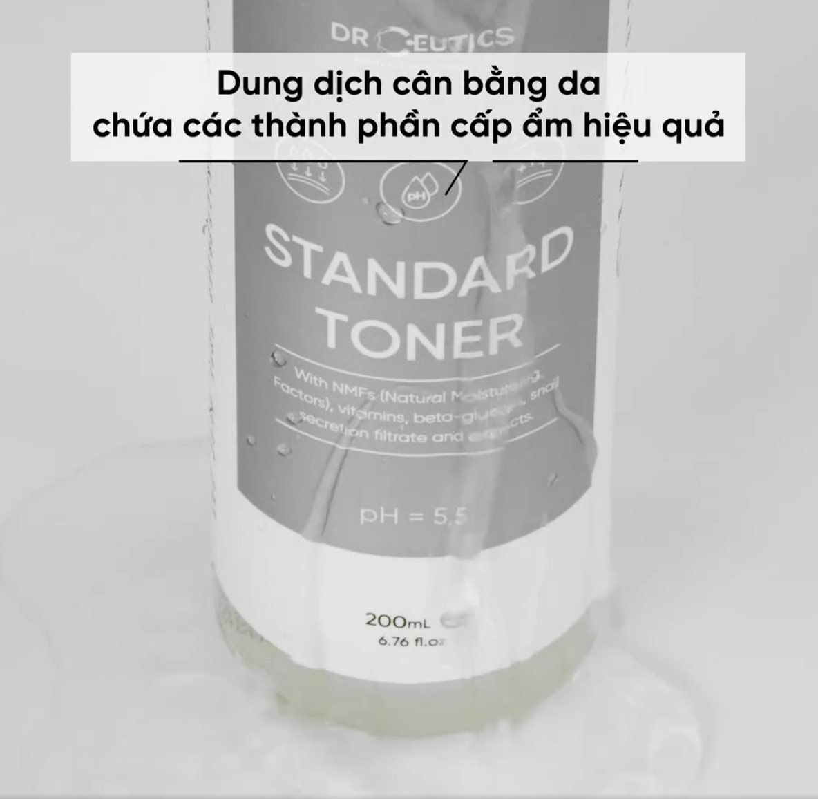 - DrCeutics Standard Toner là nước cân bằng da có công thức dồi dào các thành phần, giúp nâng tầm chu trình dưỡng da của bạn theo tiêu chuẩn dược sĩ