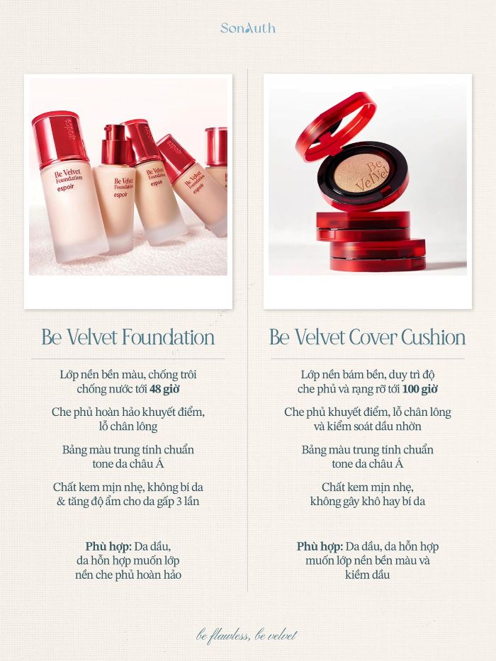 - Kem nền Espoir Be Velvet Foundation mang tới lớp nền bền màu, chống trôi, chống nước tới 48 giờ