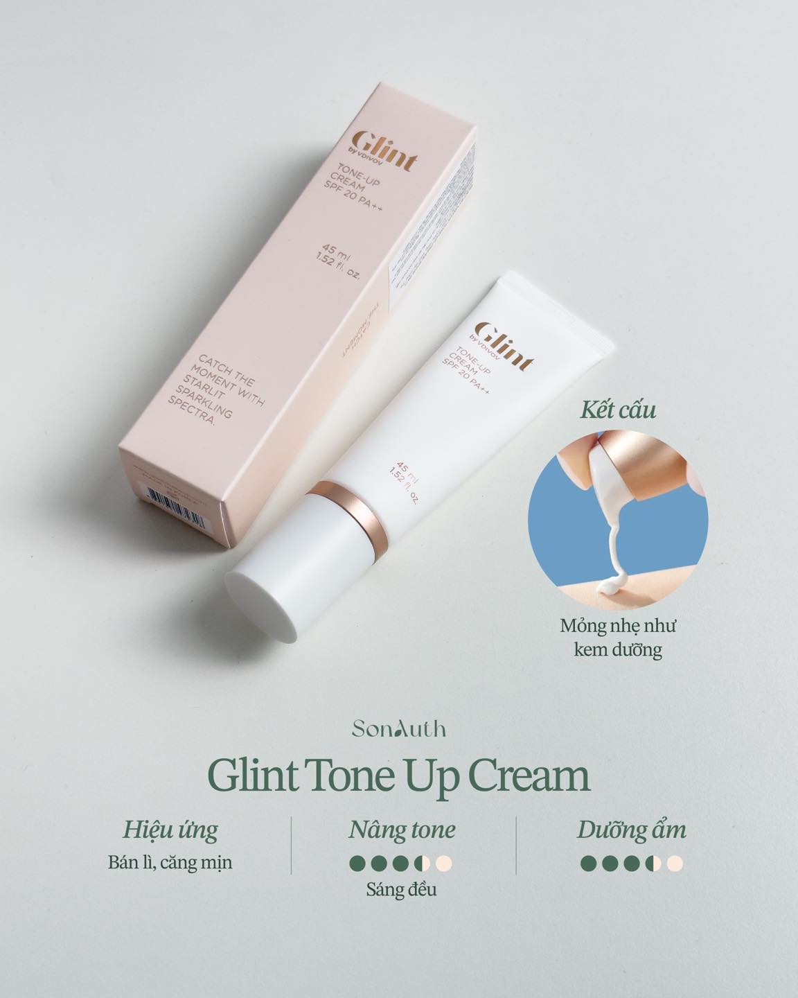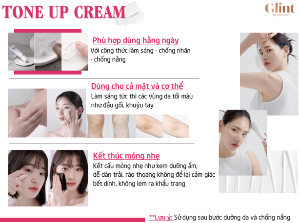 - Glint Tone Up Cream là kem nâng tông có khả năng như kem dưỡng ẩm đồng thời mang lại hiệu quả làm sáng, đều màu tự nhiên