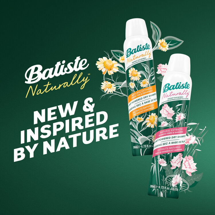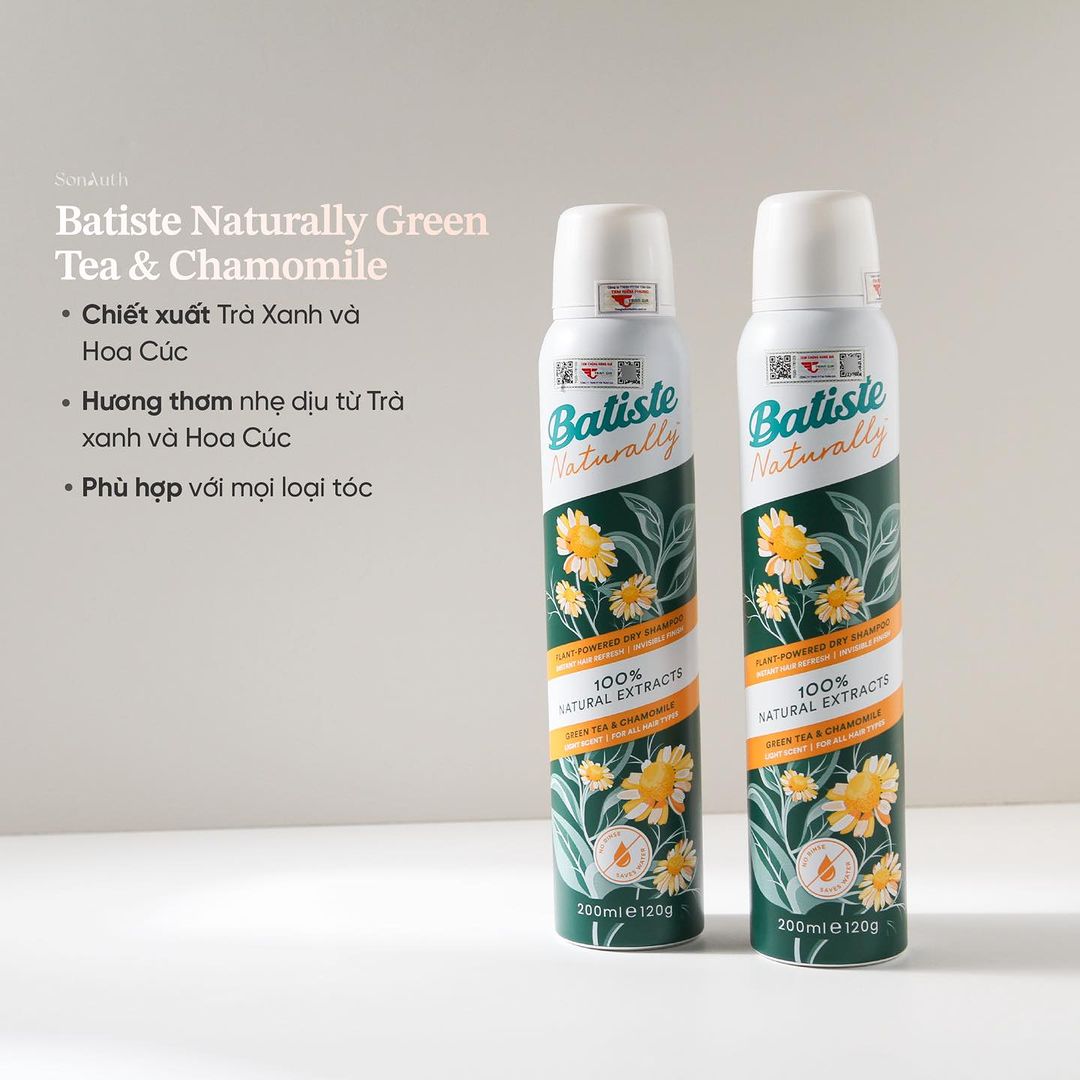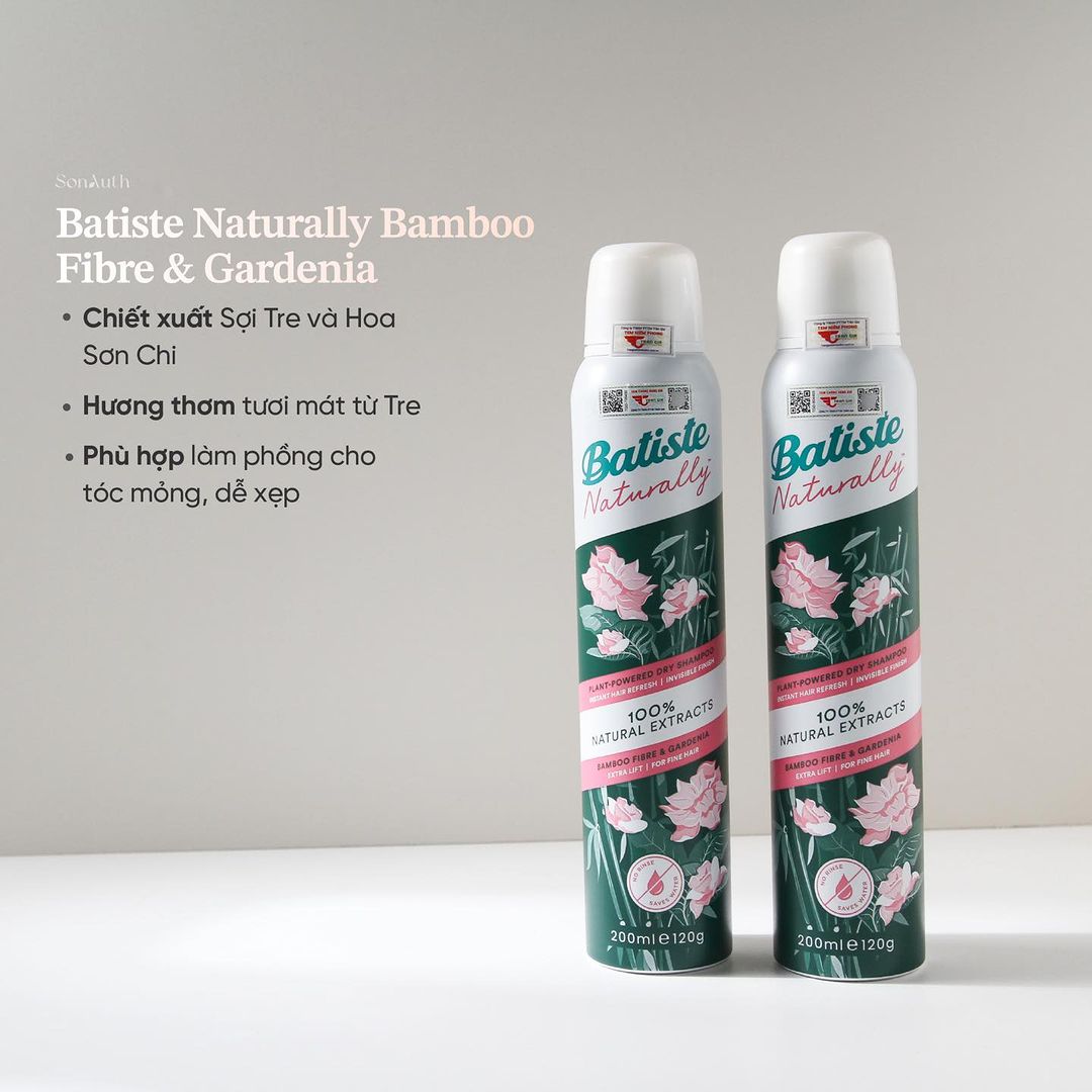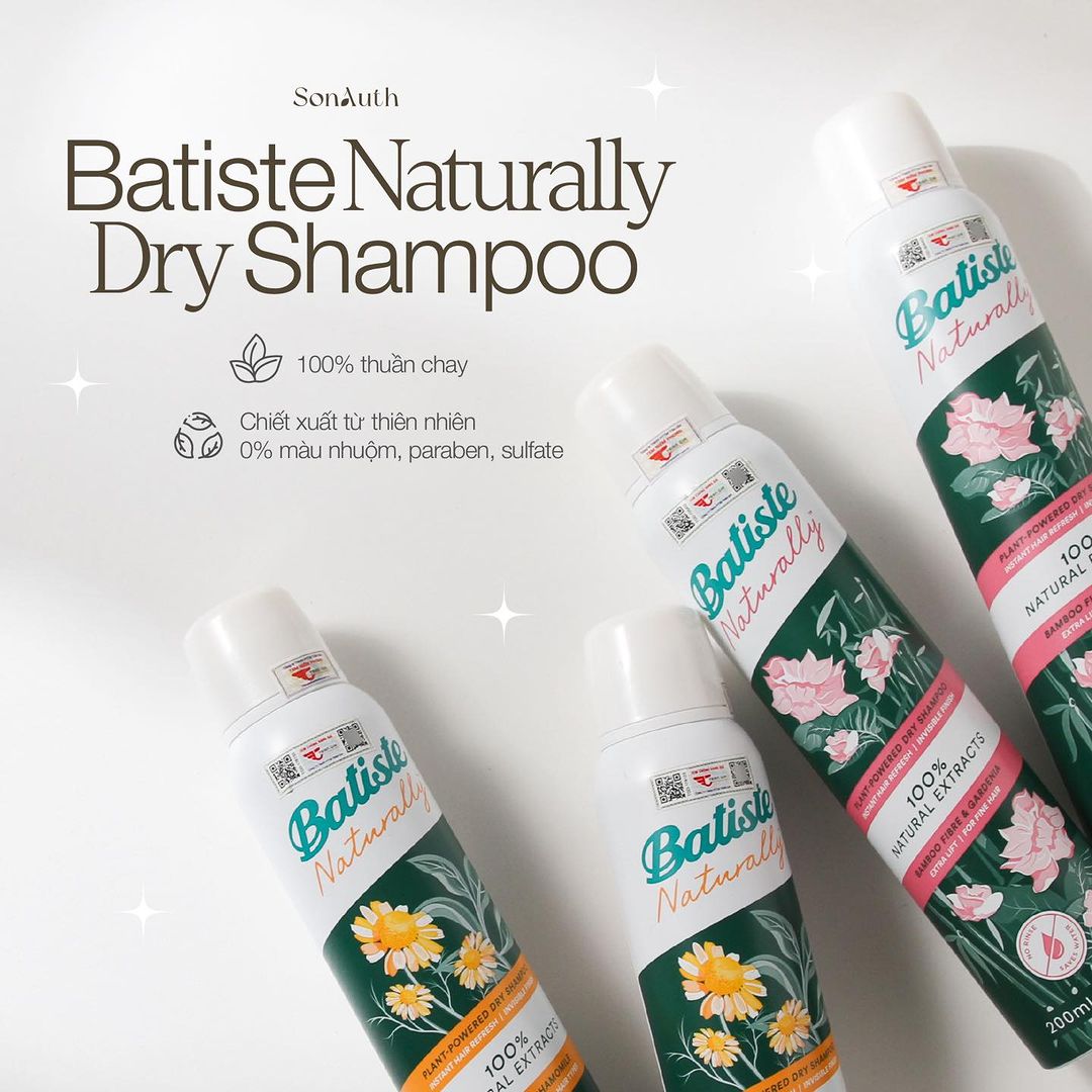 - Batiste Naturally Dry Shampoo là sản phẩm bột gội khô với 100% chiết xuất thực vật tự nhiên, đa dạng hương thơm giúp hút dầu và làm mới mái tóc mọi lúc, mọi nơi
