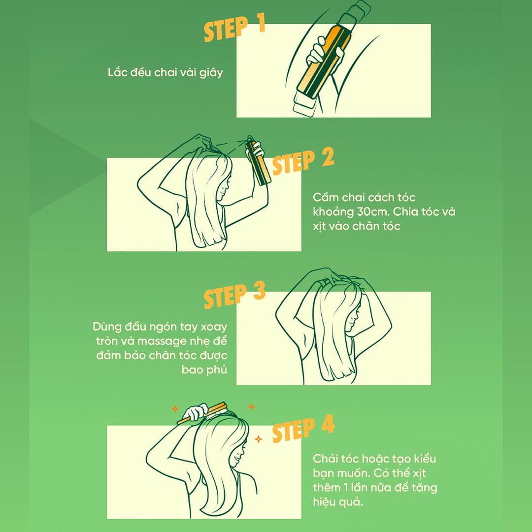 Để chai xịt cách tóc 20 - 30cm sau đó xịt trực tiếp lên tóc phía trên đỉnh đầu