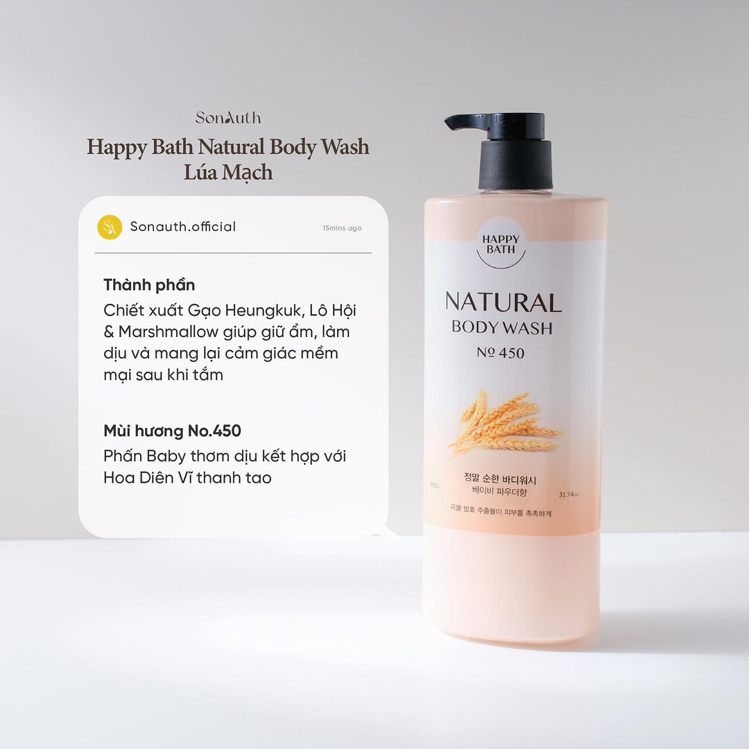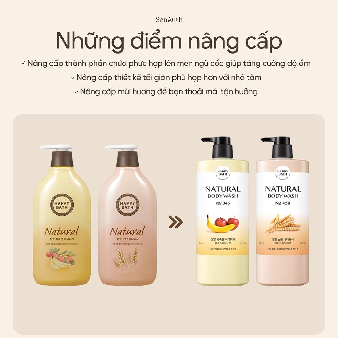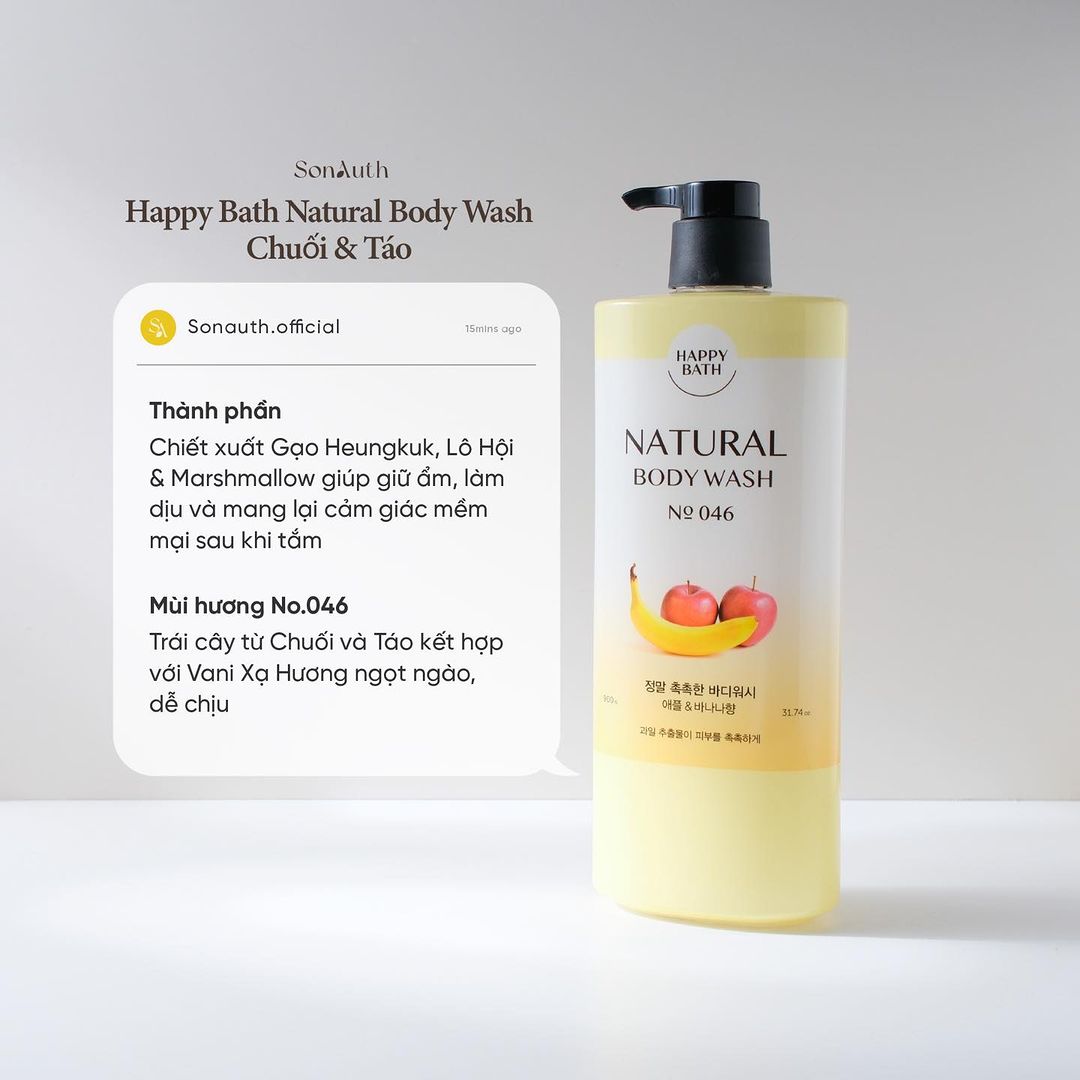 Happy Bath Natural Body Wash là dòng sữa tắm có chiết xuất từ tự nhiên, chứa các hạt tinh chất nhỏ mịn giúp nhẹ nhàng làm sạch, loại bỏ tế bào chết trên cơ thể mà vẫn duy trì độ ẩm cho da, đồng thời xua tan mệt mỏi bằng mùi hương nhẹ nhàng thanh mát từ thiên nhiên. Sản phẩm được thay mới bao bì, giúp tối ưu với không gian nhà tắm hơn, cùng hương thơm thu hút.