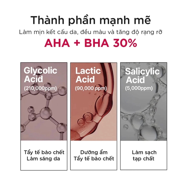 - Đây là sản phẩm tinh chất sử dụng với tần suất thấp, không sử dụng hàng ngày. Công thức chứa nồng độ hoạt chất cao giúp "tái sinh" làn da sần, lỗ chân lông to. Tổng nồng độ ACID lên đến 30%:
