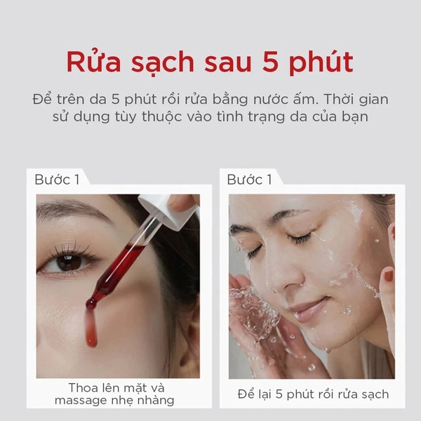 Lưu ý đây là tinh chất rửa trôi tại nhà sau 5 phút thoa trên da. Cần thử phản ứng của da trong lần đầu tiên sử dụng