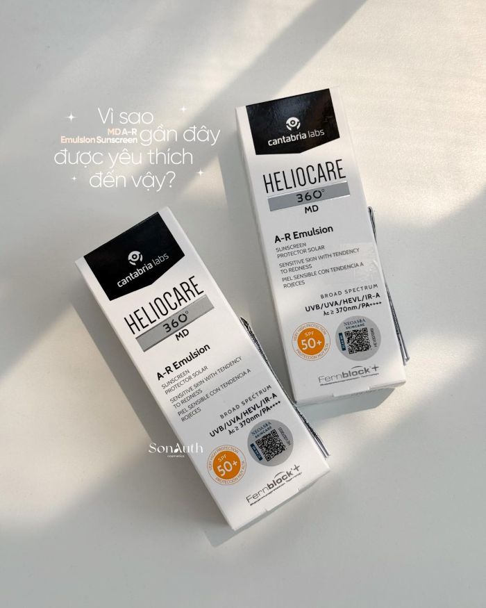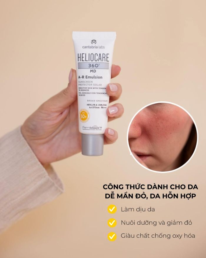 - Heliocare 360 MD A-R Emulsion Sunscreen là kem chống nắng cao cấp được thiết kế cho da nhạy cảm và dễ xuất hiện tình trạng mẩn đỏ