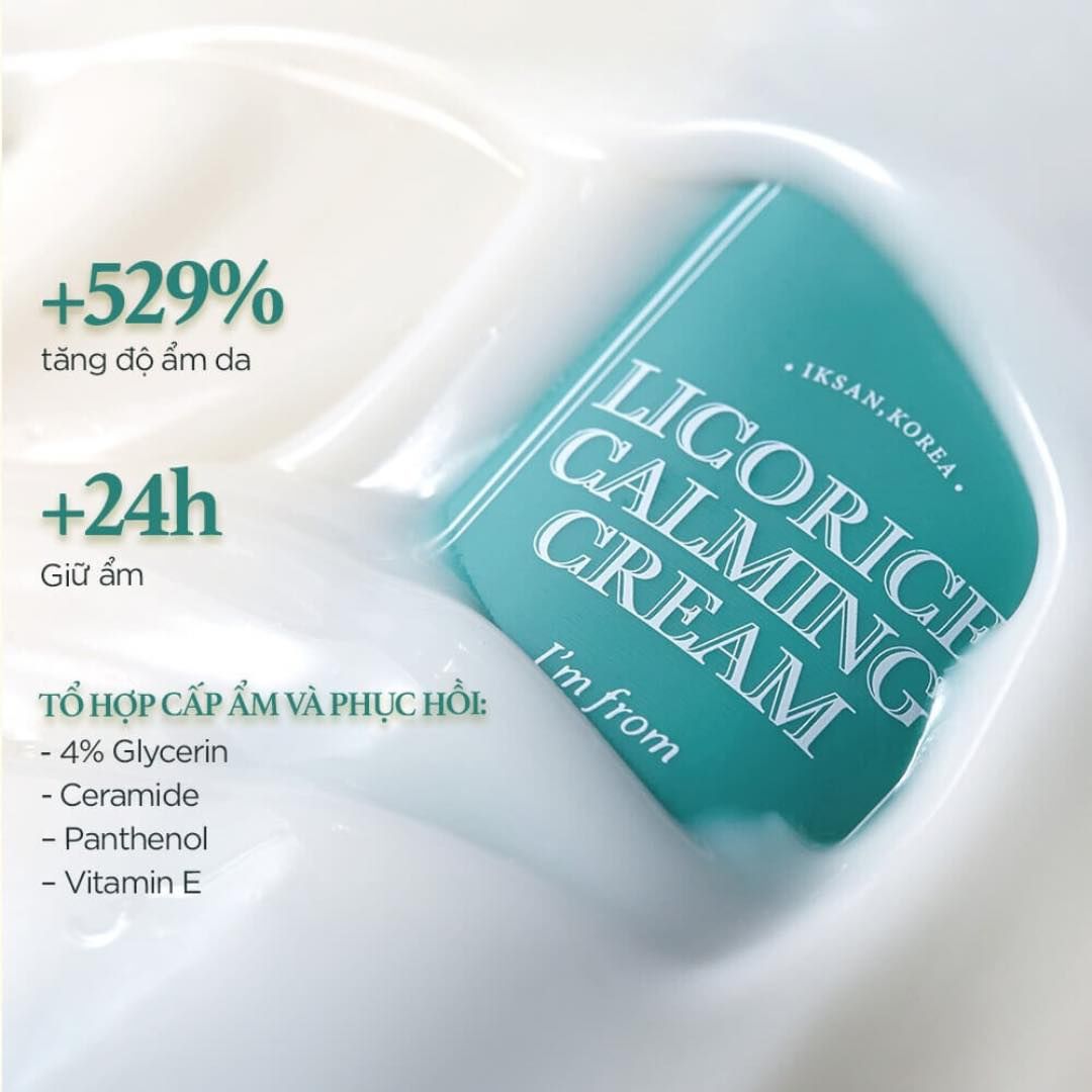 - I’m From Licorice Calming Cream là kem dưỡng ẩm chuyên khả năng phục hồi, làm dịu và giảm sự xuất hiện của sẹo sau mụn với chiết xuất chính từ Cam Thảo