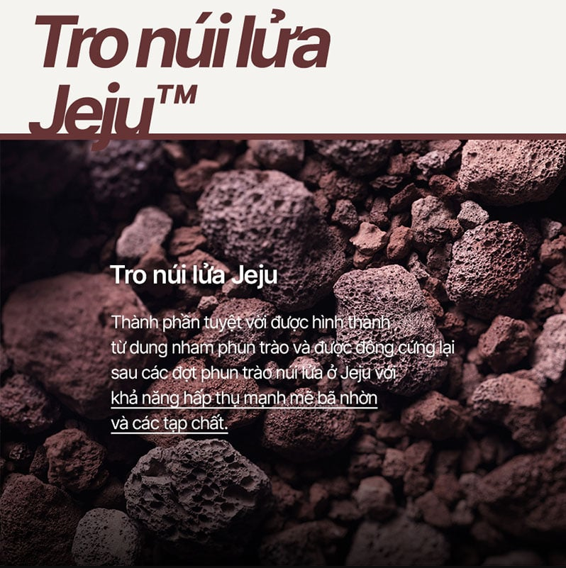 - Sản phẩm nâng cấp lên tới 9 công dụng, với thành phần chính là Hạt tro núi lửa chứa 6,020mg đất sét từ dung nham phun trào của núi lửa đảo Jeju cùng bột vỏ quả óc chó và AHA, có tác dụng: