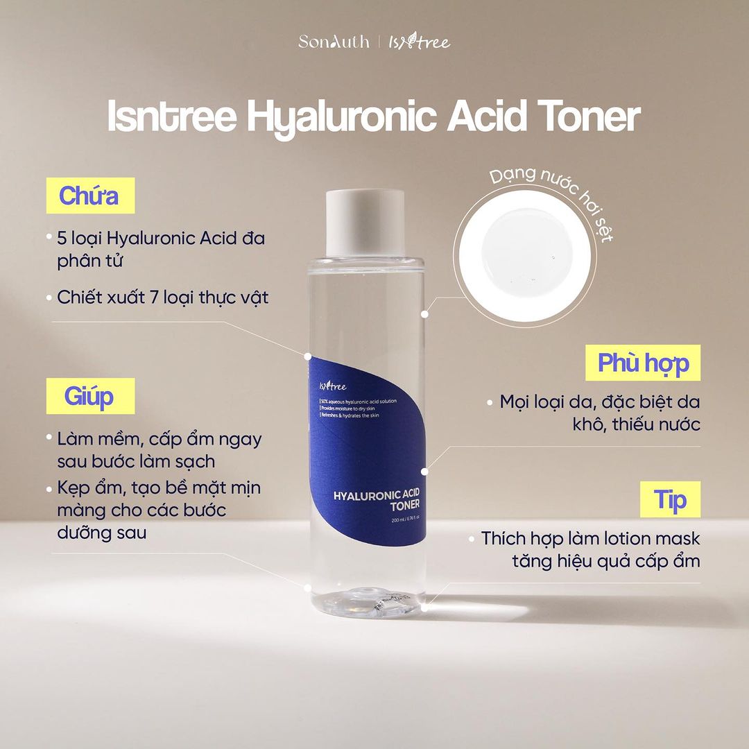 - Isntree Hyaluronic Acid Toner là nước cân bằng da được ví như "quả bom ngậm nước" với hàm lượng Hyaluronic Acid cực cao tới 50%, trong đó là 3 loại Hyaluronic Acid giúp cấp ẩm ngay lập tức, tạo lớp màng khoá ẩm chống mất nước và bảo vệ da với môi trường