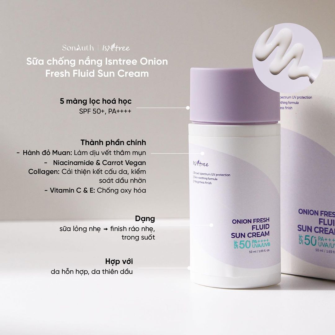 - Isntree Onion Fresh Fluid Sun Cream là kem chống nắng hiệu quả với 5 màng lọc hóa học. Chỉ số chống nắng PF50+ PA++++ bảo vệ da khỏi tia UV, tia cực tím