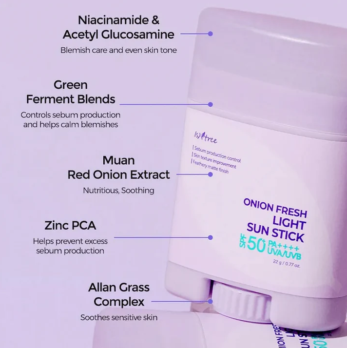 Một dòng sản phẩm độc đáo có thiết kế vỏ màu tím pastel vô cùng trẻ trung, bắt mắt của hãng chính là Onion Fresh - sản phẩm chiết xuất từ hành tây tươi. Và Isntree Onion Fresh Light Sun Stick là thanh lăn chống nắng với công thức giúp cải thiện tình trạng đổ dầu nhờn nhiều, lỗ chân lông to thường gặp vào mùa hè. Đồng thời hỗ trợ làm dịu các vết thâm trên da. Sản phẩm tiện lợi, dễ dàng mang theo bên mình mỗi khi ra ngoài.