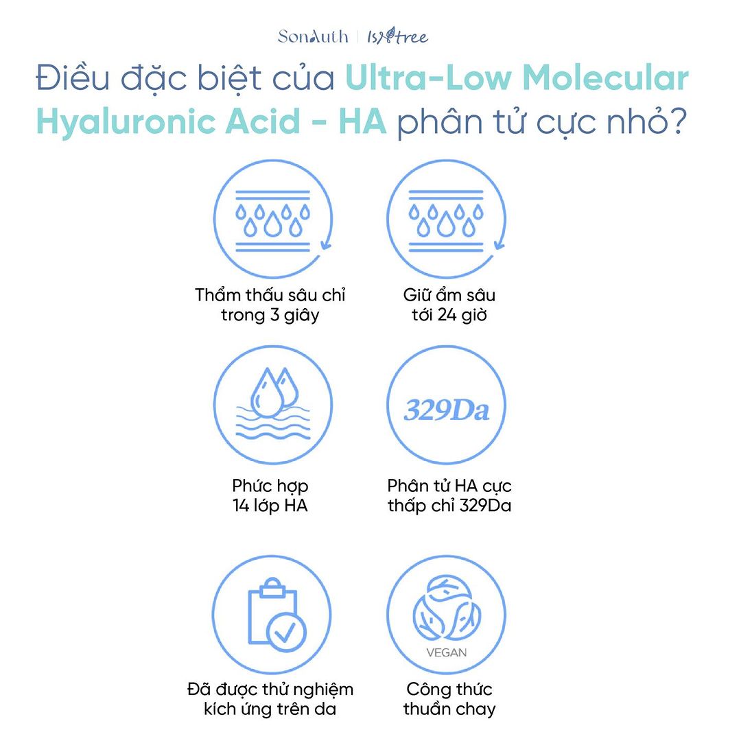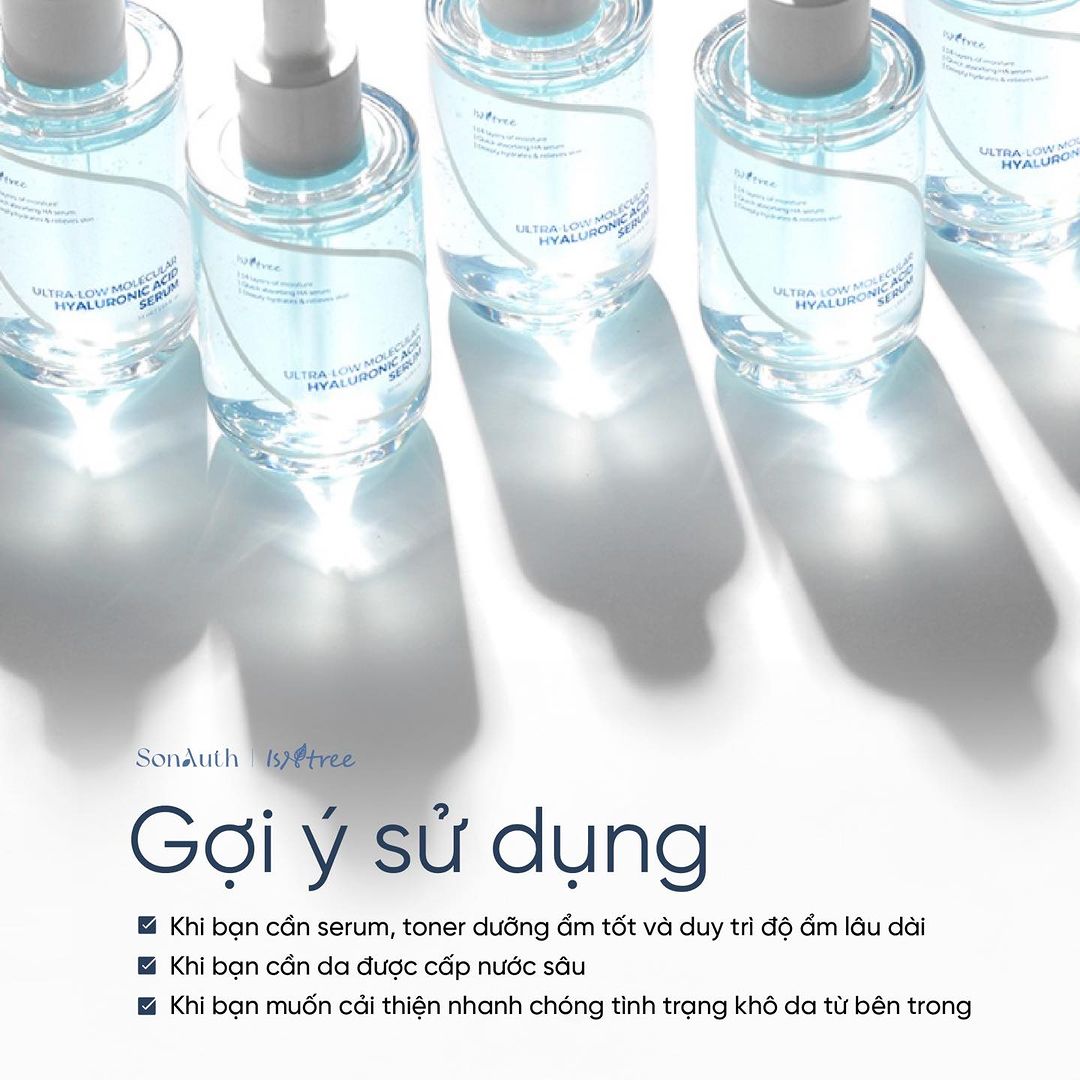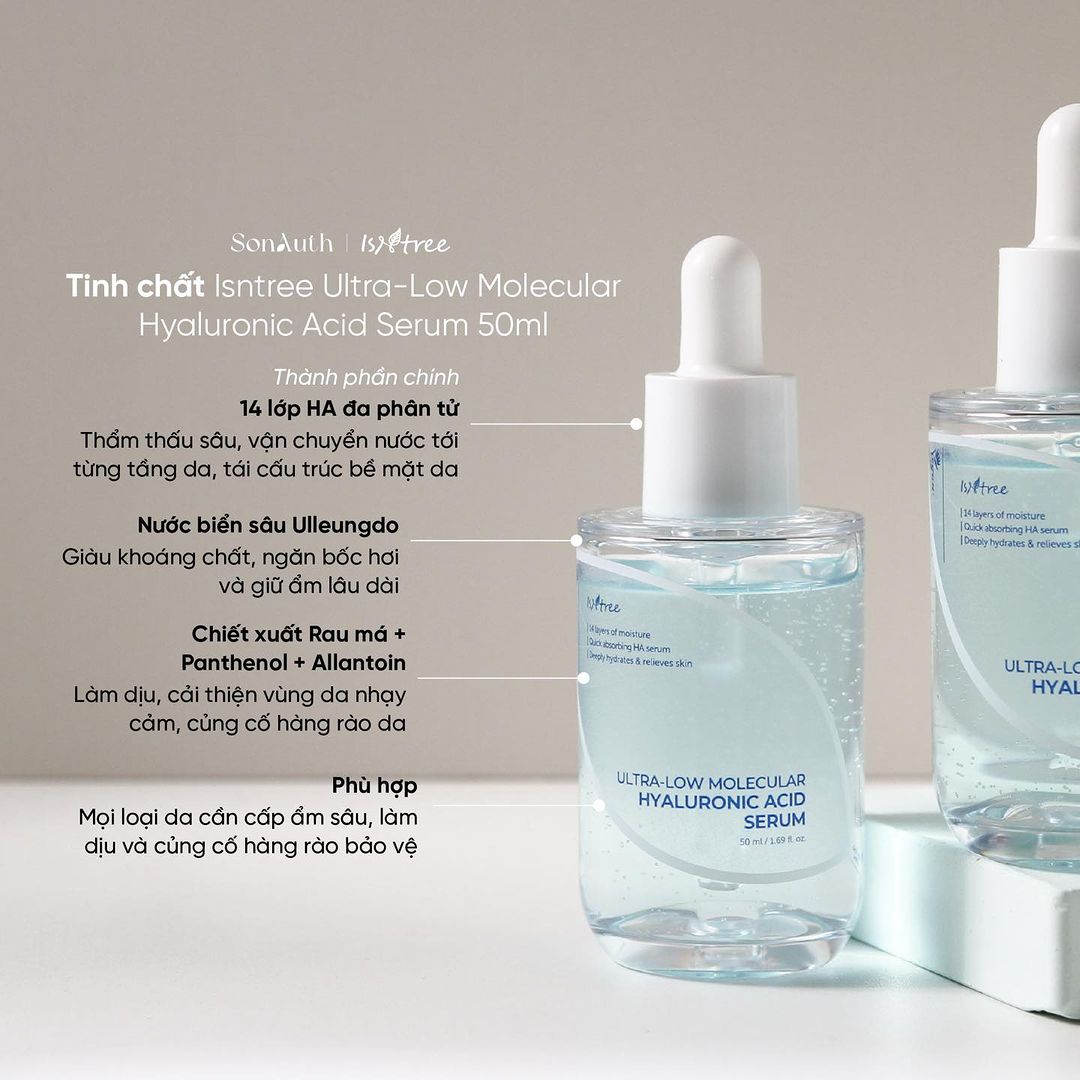 - Isntree Ultra Low Molecular Hyaluronic Acid Serum là serum cấp ẩm sâu với công thức Hyaluronic Acid đa phân tử và các chiết xuất thực vật lành tính