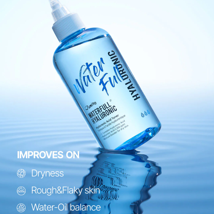 - Jumiso Waterfull Hyaluronic Toner là nước cân bằng da có thành phần chứa tới 7 gốc Hyaluronic Acid (Sodium Hyaluronate, Hydrolyzed Glycosaminoglycans, Sodium Hyaluronate Crosspolymer, Hydrolyzed Hyaluronic Acid, Hydroxypropyltrimonium Hyaluronate, Hyaluronic Acid, Sodium Acetylated Hyaluronate) với các kích thước khác nhau dễ dàng len lỏi và thấm sâu vào các tầng da, cấp nước tối ưu cho da, làm đầy và tạo độ căng mọng cho bề mặt da