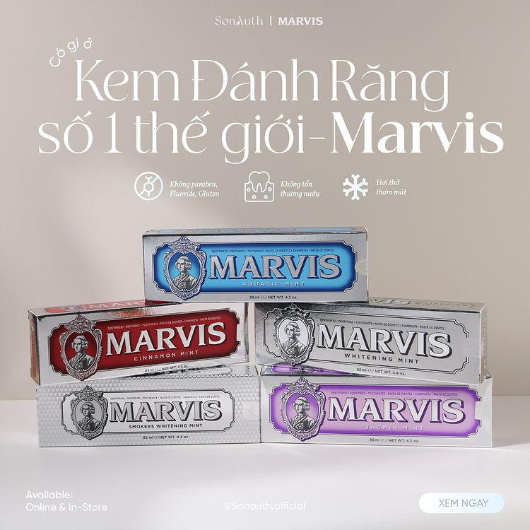 Marvis là thương hiệu chuyên về các sản phẩm nha khoa, chăm sóc sức khỏe răng miệng và nổi tiếng nhất với kem đánh răng tới từ Ý. Kem đánh răng Marvis được coi là số 1 thế giới khi đây được cho là nơi đầu tiên phát minh ra sản phẩm dạng tuýp chứa các hoạt chất giúp làm sạch răng miệng. Trải qua nhiều năm hình thành, kem đánh răng Marvis ngày càng được yêu thích với bao bì độc đáo, đẹp mắt và sự đa dạng về hương vị, mùi hương. Sản phẩm của hãng an toàn, hiệu quả cao, không làm tổn thương nướu, không chứa paraben, fluoride, gluten.
