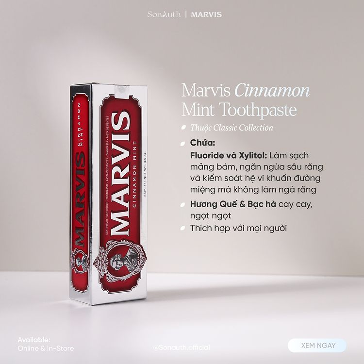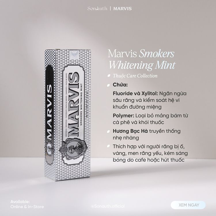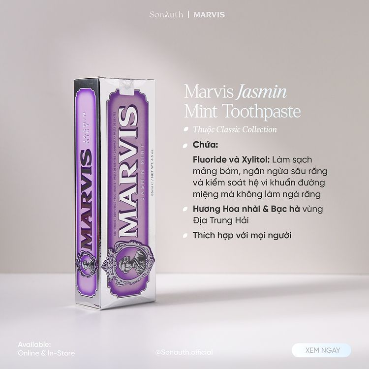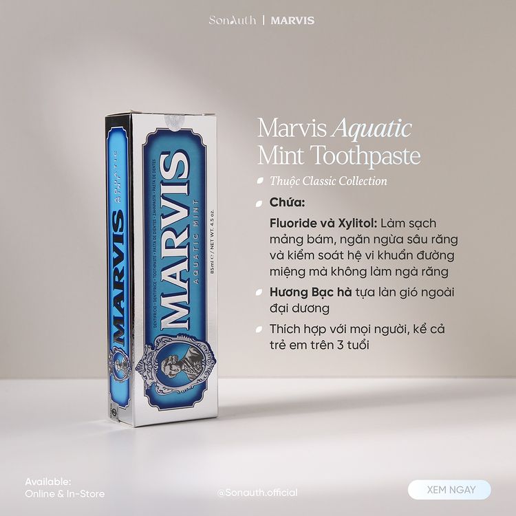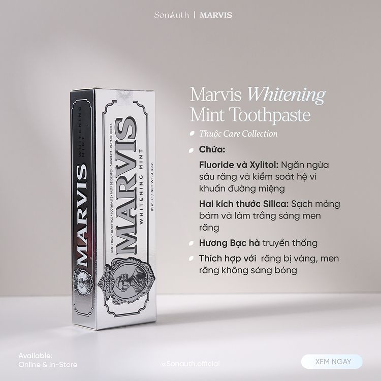 "We know, routine is boring. That's why we all need a bit of marvel" là câu slogan của Marvis, nếu routine đánh răng hàng ngày đã nhàm chán, thì có lẽ bạn sẽ cần 1 thứ mới mẻ, cầu kỳ hơn, kem đánh răng Marvis được mệnh danh là “Hermes” trong giới nha khoa, trong thiết kế sang trọng, kỳ công hoàn toàn khác biệt, cùng những công thức nha khoa an toàn và hiệu quả.