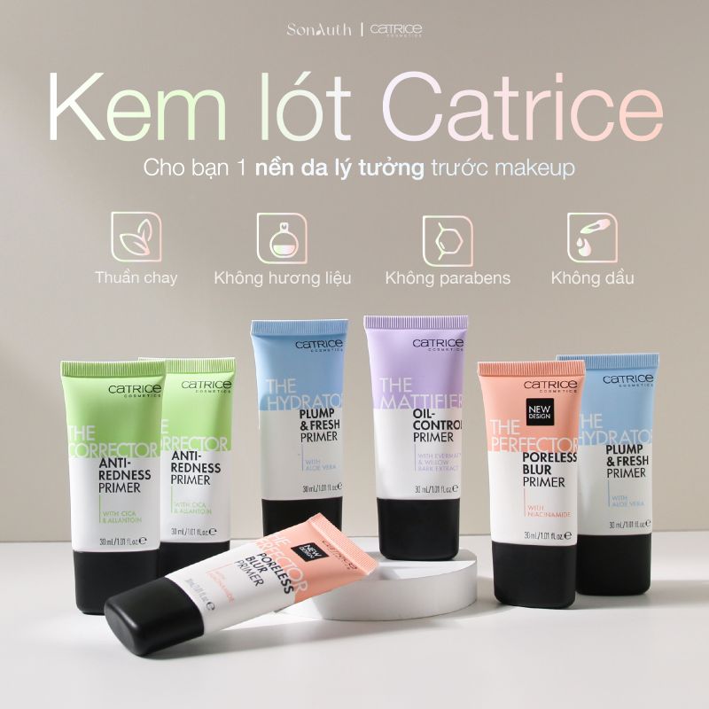 Kem lót Catrice Primer là dòng kem lót thuần chay giúp bạn chuẩn bị một nền da mịn màng, "ăn" nền và đảm bảo lớp trang điểm bền đẹp cả ngày. Thành phần thuần chay, không thử nghiệm trên động vật.
